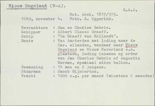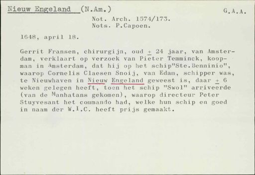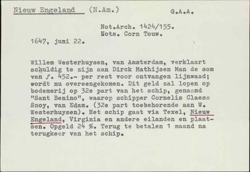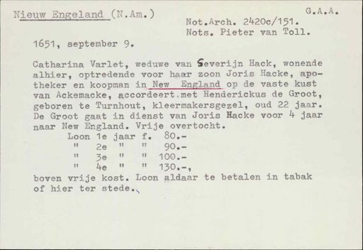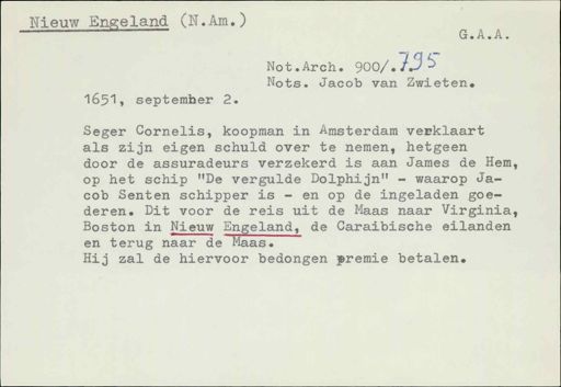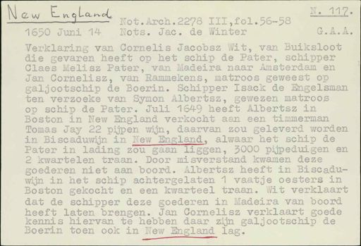 inventarisnummer 358, Regesten van akten in de Amsterdamse notariële archieven en enige andere bronnen. 1578 - ca. 1800, Collectie Hart', 'H' of 'hoofdsysteem'. Regesten geordend op trefwoord. 1578 - 1700, 1711 - ca. 1800, Aardrijkskundige namen, New England - New York de stad