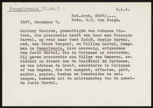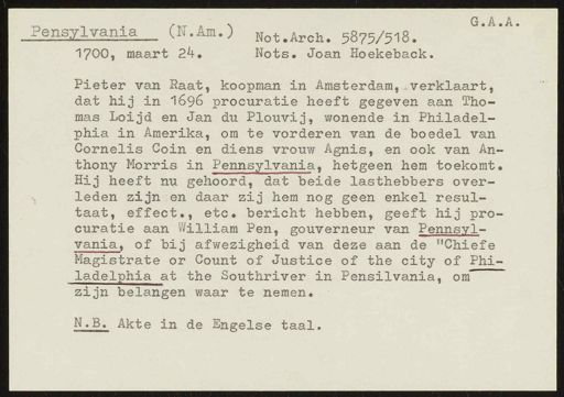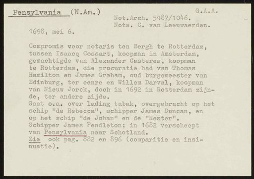 inventarisnummer 360, Regesten van akten in de Amsterdamse notariële archieven en enige andere bronnen. 1578 - ca. 1800, Collectie Hart', 'H' of 'hoofdsysteem'. Regesten geordend op trefwoord. 1578 - 1700, 1711 - ca. 1800, Aardrijkskundige namen, Pennsylvania - Yorkriver