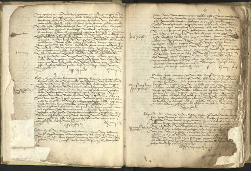 de voerscreven int geheel oic eenen vierendeel gelegen oic aldaer tusschen Jan ende Claes Schoeff eenen aende twee zyden, der taflen des Heylichs Gheests vander prochiekerken van Hombeke erve aende derde zyde ende des Heeren strate aldair aende de vierde zyde, Ende de helft van Eenen stucxken beempts houdende int geheel een half vierendeel, gelegen ter erve vander aende endest:t; vanden Wagemans ende weerde ende des goidshuys van Cortenberge erve Puttekens byden Duernen tusschen des voerscreven Jan Schooffs erve aen deen zyde Jan Wageman erve van welken drie stucken lants ende oic vanden voirgenoemde stuck beempts dander helft den voirscreven Janne vander Nuwermoelen toebehoert. In ende twee stucken lants daeraf deen geheeten is doot houdende omtrent anderhalf vierendeel ende is gelegen tot Hombeke, tusschen wylen die Jan Schoofs erve, dat nu toebehoert de voerscreven Janne aen deen zyde ende Bertelmeus vanden Bossch erve vander Nuwermoelen aen dander zyde, Ende vander stuck houdende een vierendeel is oic aldaer gelegen aende Beke, tusschen des voerscreven goidshuys van Lelyendale erve aen deen zyde ende den wech aldaer, aen dander zijde. A Domino Mechliniensi, Waranderende sonder last van chyse dair jaerlicx vutgaende Assignavit VI Peters VI marty tempore simile Jan Scholier doude Colle, Heelt, Gielis Borreman, Wouter Bogaert, Philips de Bruyne ende Aert Reysevaelde gesworene, Jan vanden Velde ende Jan de Neve busmeesters vander aelmoessen bussen vanden ambachte vanden cleermakers bynnen Mechelen hebben inden name ende om des meests orboirs ende profyts wille vander selver aelmoessen bussen vercocht Janne scholier den ouden Twee gouden Rynsguldenen, elken van dien tot veertich grooten Vlaems gelts gerekent erffelix chys die de voerscreven aelmoessen busse hadde, Op een sesse huys metten hove gronde plaetsen gaende etcetera dat wylen Lysbetten Pauwels toe plach te hoerene ende dat nu Lysbetten van Loeven haerer dochter toebehoert gelegen inde Derde Vleeschouwersstrate tusschen der weduen ende kynderen erve van wylen Janne van Loeven erve aen deen zyde ende Marien Rommonds erve aen dander zyde. A Domino Mechliniensi, Waranderende etcetera. Assignavit den XXVI denier VII may tempore simile wylen, Heelt. Jan Meynaerts diemen heet van Tylborch heeft opgedragen ende overgegeven tot behoef van Janne Mast, Een huys metten gronde etcetera dat de selven Janne Mast toe te behoeren plach ende dat de Jan Mast selve Jan van Reymaer tander tyden voir achterstellenst:t; chys die hy daerop heeft wettelic vutgewonnenst:t; ende verreyct heeft gelegen over de Zacbrugge inde Vetterstrate tusschen een ander erve dat wylen Janne Mast toe plach te hoerene ende nu den selver Janne Mast synen soon toebehoert, aen deen zyde ende wylen Everaerts vanden Wyere erve aen deen zyde,st:t; Ende een huys metten hove gronde etcetera dat oic den selven Janne Mast toe plach te hoerene gelegen aldair tegen tvoirgenoemde jerste huys over tusschen heer Gregoris van Rumpst priesters erve aen deen zyde ende Jan Thys erve aen dander zyde, geliker ende in alle der manieren de voerscreven Jan Meynaerts de voirgenoemde twee huysen metten hove, tanderen tyden voir achterstelligen chys die hy daerop heeft wettelic vutgewonnen ende verreyct heeft. A Domino Mechliniensi, sal, nu censu ovembris als VII may den sange van Sinte Peters Collem, Heelt. Meester Jan van Bost heeft vercocht Olivier van Buedeghem tot behoef vander fabriken ende sange vanden prochiekerken van Sinte Peters bynnen Mechelen, Eenen chysgulden erffelix chys die hy hadde op een cleyn plaetsen metten gronde etcetera liggende achter de Coekene vanden huyse oft woeningen vander weduen ende kynderen van wylen Peteren Anneke, tusschen tselve huys oft woeninge aende twee zyden ende wylen Gheerds Smets erve aende derde zyde gelikerwys deselve cleyn plaetse vander voerscreven wedue ende kynderen Annocke anderer cleynder plaetsen by eenen muere aldaer, gescheyden ende afgenomen is. A Domino Mechliniensi, Waranderende. Assignavit den XXVI denier VII may Broeke Henrick vanden Ryne, Rende. Henrick vanden Bossche wylen Rommonds vanden Bosse soon heeft vercocht Henricken vanden Broeke, synen oem ende vyfstedeel van eenen huyse metten hove ende met eenen anderen huyse dair achterstaende ende oic metten gronde etcetera daeraf dander vier vyfstedeelen den selven Henrick vanden Broeke toebehoeren, gelegen inde Keyserstrate van Sinte Jolyns tusschen Claes de Drivere erve aen zyde ende Gielis de Weendt erve aen dander zyde geheelen huyse jaerlix gaende Waranderende op vier pond thien scellinge payments vuter Assignavit V Rynsgulden eens ut supra