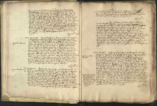 Transferens ac volens ut in forma, de den welken he, Ende aen dander zyde, heeft oic de voirscreven Roeland vander Loe gelooft, dat hy alle de sculden, de hoedanich die wesen moegen, die de voirgenoemde jouffrou Lysbeth syn goeyvrouwe ende oic de voirgenoemde jouffrou Margriete syn moeder ende oic de voirscreven Willem vander Loe syn vader, totten dage toe, dat de selve syn moeder starf, sculdich ende tachter waren Ende dueghdelic gelden ende betalen sal ende daer af den voirscreven Willem synen vader, altyt scadeloe sal quyt houden ende ontlasten, sonder eenich wederseggen Ende dat hy de vutvaert de vanden vander voirscreven wylen jouffel Margrieten synder moeder, tot synen laste ende coste sal doen doen, alsoe behoeren sal, sonder eenich wederseggen gewesen daer tegen te sulken XVIa decembris tempore simile Johanne Andries Dale, Schooff. Jacop Waghen, diemen heet de Zaghere ende Lysbeth sMolders syn wyf, die inde lyfpensie, hier naer bescreven, hair heffen ende dispositie hadden inden name van hen selven ende oic inden name van Joes de Waghevens, diemen heet de Zaghere, haerlieden soon, die sy in hen vervinghen, hebben vercocht Janne Andries, wylen Henricx andries soon, die gouden Rynsgulden goede etcetera te wetten veertich groote Vlaems gelts voir elken van dien gerekent jaerlike lyfpensien, die de voirscreven Jacop ende weer syn soon, tot haren live ende tot des langhstlevende live van hen beyden, hadden, Op de voirscreven Jan Andries twee huysen metten hoven, gronde etcetera gelegen deen neven dander opte dekene, tusschen heer Martens van Lanchem priesters erve aen deen zyde ende wylen Peter erve Lymmaers dat nu synen kynderen toebehoirt aen dander zijde. A Magriete Egidius de Muysene, Waranderende etcetera XVII decembris d Gerardine Diericx Dale, Expoele. Jaspar vander Lynden, heeft vercocht Janne Barbier, tot behoef van Gheerde Diericx van Aersschot vier gouden croonen vander munten etcetera goede, Te wetene zesse scellinge groten Brabants gelts voir elke van dien cronen gerekent, Te heffen altyt tot Kersmisse vutgenomen den yersten Kersmisse Op ende aen des voirscreven Jaspars huys metten gronde etcetera gelegen aenden Sterwech, achter de Vischbrugge van Mechelen tusschen thuys derten geheeten, toehoerende Goessen vanden Dale aen deen zyde ende thuys Ruplemonde geheeten toehoiren Bartelmeus Bake, aen dander zyde, Opte weerde van drie ponden neghen scellinge groten Vlaems gelts erffelic gelike ende op twintich scellinge groten lyfpensien, daer jaerlicx voir vutgaende, Ende op des voirscreven Jaspars huys metten tusschen hove gronde gelegen inde Corte Scipstrate op twee chysgulden daer jaerlicx voir vutgaende. A Domino Mechliniensi, Waranderende etcetera. XXVIIIa decembry Jan ende Willem de laet, wylen Willems de laet kynderen, hebben opgedragen ende overgegeven haren stiefvader tot behoef van Olivier van boven alle alsulke haeffelike erffelike goeden, bynnen der stad ende verheyt van Mechelen, gelegen, als den voirscreven Jan ende wille de laet, byder doot van wylen Lysbetten van Eyndont, diemen heet van Lynth haerer moeder ende des voirscreven Oliviers leste wyf doen sy leefde in eeniger manieren verstorven moegen. A Domino Mechliniensi, Waranderende etcete. voertaen, hebben de voirscreven Jan ende Willem de Laet gebruederen, Quytgesconden los vry ende ledich, den voirscreven Olivier van allen den haeffeliken goeden, die henlieden oic byder doot vanden voirscreven wylen Lysbetten, haer moeder oic gebleven ende verstorven syn Oliveeus de boven Dale, Duffle. Olivier van Boen heeft opgedragen syn tocht, die hy hadde inde helft van eenen huyse metten hove gronde etcetera gelegen inde Blocstrate, tusschen der weduen ende kynderen erve van wylen Janne van Voesdonc, aen deen zyde ende der weduen ende kynderen van wylen Marten de Costere erve aen dander zyde. A Domino Mechliniensi, Juravit tot behoef van Janne, Willem ende Margrieten de Late wylen Willeme de Laet ende wylen Lysbetten van Eyndont Coel diemen heet van Eyndt syns wyfs kynderen, welke van ende wille, tot haere ende der voirscreven Magriete haer zuster behoef waerde daerinne yerst geerft, Ende dair naer, hebben de selve Jan ende Willem de Laet gebruederen, opgedragen ende overgegeven tot behoef vanden voirscreven Oliviere, haer twee derdedeelen vanden voirscreven helft vanden voirscreven huyse metten hove dairaff dander derdendeel der voirscreven Magrieten toebehoirt ware voertaen hebben de selve Jan ende Willem de laet, zyn Quytgesconden los vry ende ledich, den voirscreven Olivier van allen den haeffelike goeden, die henlieden, byder doot vander voirscreven wylen Lysbetten van Eyndont haere moeder gebleven ende verstorven syn die henlieden byder doot vander voirscreven wylen Lysbetten van Endont haer moeder een deen voirscreven Olivers lesten wive verstorven syn XXII decembris