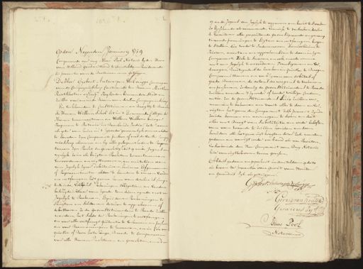 Op den Negenden January 1759 Compareerde voor my Isaac Pool Notaris by den Hove van Holland geadmitteerd te Amsteldam Residerende ter presentie van de natenoemene getuygen De Heer Gysbert Antwerpen Verbrugge Compagne van de Compagnieschap Canterende ten naame Marthen Rietschoten & Compe. Kooplieden binnen deze Stadt en zulks voor en in de naam van dezelve Compagniescha¬ En verklaarden te Constitueeren en magtig te maat de Heeren Willem Schol Lit in 't Eerwaarde Collegie de Heeren weesmeesteren en Willem Welborn burger¬ Koopman te Batavia in neerlands India, zo te zaan als yder van hun in 't byzonder generalyk omme alde te Landen zyn Comparants persoon of wel de voorsz: Comp nieschap alomme en by alle gelegentheden te Repres¬ teeren zyn Recht on gerechtigheit op ende Jegens ee ygelyk zo in als buyten Rechten waartenemen vervorderen en uyttevoeren, en mitsdien van een jegelyk zyner debiteuren, hunne Erfgenaam of Representanten aldaar te Landen te innen verder en ontfangen, het geene hem van dezelve is Comp¬ terende, volgens Rekeningen obligatien en verdere beschyden idaar van zynde ten dien eynde met es¬ Iegelyk te Reekenen, Liquideeren Reekeningen te sluyten en saldeeren dezelve te approbeeren of debatteeren zo de geconstitueerdens te Raade zulle werden, het saldo de Reekeningen te ontfangen en voor alle ontfangst quitantie te verleenen en passere en voor namaningen te Caveeren, en in Cas van questie of non betalange, meede te Compareren voor alle Heeren Rechteren en gerechten, en aldaa op ende Jegens een Iegelyk te aggeeren en Recht te spreeke zo Eysschende als verwerende, vonnisse te versoeken, dezelve te Executeren alle geexcuteerde geconsigneerde en genam¬ tireerde penningen te Ligten en ontfangen, borgen te stellen, die weder te Indemneren Domicilium te Kiezen, arresten en apprehensien te doen in zyn Comparants ziele te sweren, en ook meede omme met een Iegelyk te accorderen, Transigeeren en ver¬ draagen, mitsgaders de zaaken in questie te moge compromitteeren en verblyven aan arbiters of goede mannen, de actens deswegens te teekenen en passeeren, zodanig de geconstitueerdens te Raade¬ zullen werden 't zy onder of zonder willige Condem¬ nutie, zoo de geconstitueerdens sulx zullen ver¬ meenen te behooren en voorts alles te doen en ver¬ rigten het geene den Comparant zelfs present zynde zoude konnen en vermogen te doen en dat alles met magt van substitutie en onder belofte van van waarde te zullen houden en doen houden all het gene uyt kragten dezes zal werden gedaan en verrigt onder verband als na Rechten versoekende den Heer Comparant aan my Notaris hier van uytteleveren twee grossen Aldus gedaan en gepasseert in Amsteldam op dato als boven ter presentie van Gerrit van Houten en Gerardus Pyl als getuygen. Gastert Antwerper Debbingge &l Gerrit van Houten Gerardus Byt Isaac Pool Notaris