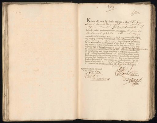N. 13 Calkoen Know all men by these presents, that Caspar Louis kerksteen of Aarn hem Es. being at present in thw Cittij of Amsteldam do hereby make, nominate constitute, and appoint. M. Gerard Bolwerk of Londen Merchant mis true and Lawfus Attorny, for me and in my pameio sell assigne and transfery all or any part or parts of Iire thousand Vounds Capl. being oll my Interest in the Capital Stock of the bouverhour and Company of the Bank of England, unto any person or persons whatsoever, and for such price or prices, con¬ sideratien sujm or sums of money, as my said attornevshal think allso Abralldiridents nowdce on the Jand Stock tt. and to receive the moneyes for the same, and to do every Lawtus¬ act and acts thing and things whatsoever in and about the premisses, asselt might or cousd do were personally present, hereby Ratifying, confirming, and holding good and valid, what soe ver my said Attorney shall Lawfussy do, or cause to be done in and ab out the same. In wittness whereof I have hereuntg sett my hand and seal. In Am¬ Aehdam osoresaid dts twenty fourthda 88 October No. one mousand seven mandred and f fly no 61110 0v0 Signed sealed and delivered 4 in the presence of us W van Gulik WDerkseen Ns: van veen Barels Nen