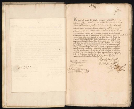 No. 33 Calkoen Anow all men by these presents that Wee¬ David Ozorio Junior and David de Joseph de La Penha of Amsteldam Merchants do hereby make, nominate constitute, and appoint Mr. Jacob Percira of L ondon Merchant our Joint true and Lawfull Attorny, for D and in oumame to sell assigne and transferr all or any part or parts of ond hundred one poundster Thettar eightpepeelrot our Interest in the Joint Stock of South Sed of the secord hebscription Annuities unto any person or persons whatsoever, and for sich price or prices, consideration sum or sums of money, as over said attorney shall think fit. and to receive the moneyes for the same, and do even Lawfull actand acts, thing and things whatsoever, in and about the pre¬ mittes, as wee self might or could do, were wee personnally present Hereby ratifying, confirming, and holding good and vallid, what soeven dur said Attorney shall Lawfully do, or cause to bedone in and abois the same. In wittness whereof wa have hereunto lett ourhand and seals In Amsteldam aforesaid this Seventeentrday of October Ao. one thousand seven hundred and fisty tio Stilo Novo aniosinsJunior signed sealed and delivered in the presence of us David & Jonpl dls Bera VVan Gulik DBarels Jan Pollaer min