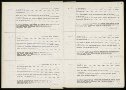 Gebruik tekstcoördinaten Transcriptie No. 4 Op vijf Maart - - - - - - ------negentienhonderd drie en veertig is in Sobibor in Polen- - - - - - - - - - - - - - - - ----- overleden: Polak, Judith, - - - - - - - - - - - - - - - - - - - - - - - - -- : geboren vijf April achttienhonderd vijf en zeventig - - - - - - -- in Amsterdam,- - - - - - - - - - - - - ------ wonende in Amsterdam. laatstelijk gehuwd met Aronson,Abraham, dochter van: Polak, Isaac en: Salzedo, Rebecca.- - - - - - - - - - - - - - - - - - - - - -- -- De aangifte van dit overlijden is aan mij, Ambtenaar van de Burgerlijke Stand van Amsterdam, schriftelk gedaan vanwege de Minister van Justitle Waarvan akte, welke door mij is ingeschreven op heden, vijftien December - - - - -- negentienhonderd negen en veertig Donker No.7 Op vijf Maart - - - - - - ------ negentienhonderd drie en veertig is in Sobibor in Polen - - - - - - - - - - - - - - - ----- overleden: Spanjar, Dina,- - - - - - - - - - - - - - - - - - - - - - - - -- - geboren acht en twintig Mei achttienhonderd vier en zeventig- - - in Amsterdam,- - - - - - - - - - - - - - ---- wonende in Amsterdam, laatstelijk gehuwd met van Cleef, Jochem, dochter van: Spanjar, Salomon en: Mof,Sara.- - - - - - - - - - - - - - - - - - - - - -- - - De aangifte van dit overlijden is aan mij, Ambtenaar van de Burgerlijke Stand van Amsterdam, schrifteljk gedaan vanwege de Minister van Justitle. Waarvan akte, welke door mij is ingeschreven op heden, vijftien December - - - - -- negentienhonderd negen en veertig. Donk — No. 5 Op vijf Maart - - - - - - - ---- -negentienhonderd drie en veertig is in Sobibor in-Polen- - - - - - - - - - - - - - - - ----- overleden: Seijffers, Louisa; - - - - - - - - - - - - - - - - - - - - - - -- -- geboren zeventien November achttienhonderd negen en zestig - - - - in's-Hertogenbosch,- - - - - - - - - - - - - - - - wonende in Amsterdam, laatstelijk gehuwd met Bierman, Levie, dochter van: Seijffers, Sa- lomon Marcus en: Heijmans, Betje. - -- - - - - - - - - - - - - - -- - De aangifte van dit overlijden is aan mij, Ambtenaar van de Burgerlijke Stand van Amsterdam, schrifteljk gedaan vanwege de Minister van Justltie Waarvan akte, welke door mij is ingeschreven op heden, vijftien December - - - - -- negentienhonderd negen en veertig. Vooti Op vijf Maart - - - - - - - ----- negentienhonderd drie en veertig is in Sobibor in Polen--- - - - - - - - - - - - - - - -overleden: van Geens, Betje,- - - - - - - - - - - - - - - - - - - - - - - - -- - geboren acht en twintig April achttienhonderd negen en tachtig - - in Amsterdam,- - - - - - - - - - - - - - - ----wonende in Amsterdam, laatstelijk gehuwd met Erwteman, Simon, dochter van: van Geens, Jonas en: Halberstadt,Margaretha.- - - - - - - - - - - - - - - - -- - De aangifte van dit overlijden is aan mij, Ambtenaar van de Burgerlijke Stand van Amsterdam, schriftelijk gedaan vanwege de Minister van Justitie Waarvan akte, welke door mij is ingeschreven op heden, vijftien December - - - - -- negentienhonderd negen en veertig. Donker No. 6. .--.negentienhonderd drie en veertig is in Op vijf Maart --- Sobibor in Polen- - - - - - - - - - - - - - - - - ---- overleden: . Smit, Rebecca; - - - - - - - - - - - - - - - - - - - - - - - - -- - geboren negen Augustus achttienhonderd drie en zeventig - - - - -- in Amsterdam,- - - - - - - - - - -------- wonende in Amsterdam. laatstelijk gehuwd met Blanes, Gabriel, dochter van: Smit, Heyman Levie en: Velleman, Marianne.- - - - - - - - - - - - - - - - - -- „ De aangifte van dit overlijden is aan mij, Ambtenaar van de Burgerlijke Stand van Amsterdam, schrifteljk gedaan vanwege de Minister van Justitie Waarvan akte, welke door mij is ingeschreven op heden, vijftien December - - - - -- negentienhonderd negen en veertig. Donk No. 9 Op vijf Maart - - - - - - ------ negentienhonderd drie en veertig is in Sobibor in Polen - - - - - - - - - - - - - - - - overleden: van Gelder,Aaltje,- - - - - - - - - - - - - - - - - - - - - - -- - geboren acht Maart achttienhonderd vijf en zestig- - - - - - - - -- in Harlingen,- - - - - - - - - - - - - - ------wonende in Amsterdam. laatstelijk gehuwd met Blok, Salomon, dochter van: van Gelder, Mozes en: Trompetter, Rachel.- - - - - - - - - - - - - - - - - - -- De aangifte van dit overlijden is aan mij, Ambtenaar van de Burgerlijke Stand van Amsterdam, schrifteljl gedaan vanwege de Minister van Justitie. Waarvan akte, welke door mij is ingeschreven op heden, vijftien December - - - - negentienhonderd negen en veertig. Donken
