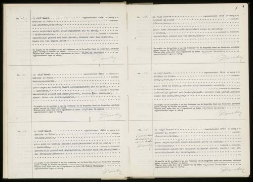 No. 10 Op vijf Maart - - - - - - - ------negentienhonderd drie en veertig is in Sobibor in Polen - - - - - - - - - - - - - - - - ------overleden: vanGelderen, Henrietta,- - - - - - - - - - - - - - - - - - - - -- -- geboren zeventien April achttienhonderd zes en zestig - - - - - -- in Hellevoetsluis,- -- - - - - - - - - - - - ---- wonende in Amsterdam, laatstelijk gehuwd met Boot, Israel, dochter van: vanGelderen, Mozes en: van Engers, Ester.- - - - - - - - - - - - - - - - - - -- - De aangifte van dit overlijden is aan mij, Ambtenaar van de Burgerlijke Stand van Amsterdam, schriftelk gedaan vanwege de Minister van Justitie Waarvan akte, welke door mij is ingeschreven op heden, vijftien December - - - --- negentienhonderd negen en veertig. Donte No. 183 Op vijf Maart- - - - - - - - - ----- negentienhonderd drie en veertig is in Sobibor in Polen- - - - - - - - - - - - - - - - - - ---- overleden: Kösters, Dora,- - - - - - - - - - - - - - - - - - - - - - - - - - - -- geboren twee Februari achttienhonderd zeven en zeventig- - - - - -- in Crefeld,- - - - - - - - - - - - - - - - -----wonende in Amsterdam, laatstelijk gehuwd met van Emden, Ruben.- - - - - - - - - - - - -- - - - -- De aangifte van dit overlijden is aan mij, Ambtenaar van de Burgerlijke Stand van Amsterdam, schrifteljk gedaan vanwege de Minister van Justitie Waarvan akte, welke door mij is ingeschreven op heden, vijftien December- - - - - -- negentienhonderd negen en veertig. Donken No. 11. Op vijf Maart - - - - - - ------ negentienhonderd drie en veertig is in Sobibor in Polen - - - - - - - - - - - - - - - - -----overleden: Hamburger, Rosette,- - - - - - - - - - - - - - - - - - - - - - - -- -- geboren negen en twintig Maart achttienhonderd zes en zestig - - -- in Amsterdam,- - - - - - - - - - - - - - - --- wonende in Amsterdam, laatstelijk gehuwd met Baune, Salomon, dochter Jan: Hamburger, - -- Samuel Simon en: Andries,Saartje.- - - - - - - - - - - - - - - - - De aangifte van dit overlijden is aan mij. Ambtenaar van de Burgerlijke Stand van Amsterdam, schrifteljk gedaan vanwege de Minister van Justitie. Waarvan akte, welke door mij is ingeschreven op heden, vijftien December - - - - - - negentienhonderd negen en veertig. Jonken No. 14. Op vijf Maart- - - - - - - - ----- negentienhonderd, drie en veertig is in Sobibor in Polen- - - - - - - - - - - - - - - - - - ----overleden: Lewijt, Grietje,- - - - - - - - - - - - - - - - - - - - - - - - - - geboren drie en twintig October achttienhonderd zeventig- - - - --- in Amsterdam,- - - - - - - - - - - - - - ------wonende in Amsterdam. laatstelijk gehuwd met Coster,Emanuél, dochter van: Lewijt,Abraham Moses en: Schrijver,Betje.- - - - - - - - - - - - - - - - - - -- - --- De aangifte van dit overlijden is aan mij, Ambtenaar van de Burgerlijke Stand van Amsterdam, schrifteljk gedaan vanwege de Minister van Justitie. Waarvan akte, welke door mij is ingeschreven op heden, vijftien December- - - - - -- negentienhonderd negen en veertig. Donken No. 12 Op vijf Maart - - - - - - ------ negentienhonderd. drie en veertig is in Sobibor- in Polen - - - - - - - - - - - - - - - - ----- overleden: Heijmenn, Sophia,- - - - - - - - - - - - - - - - - - - - - - - --- -- geboren acht en twintig Januari achttienhonderd vijf en zestig - --- in Amsterdam,- - - - - - - - - - - - - - --- wonende in Amsterdam. laatstelijk gehuwd met Engel,Moritz,,dochter van: Heijmann, Isaak - en: Göttinger, Rebecca.- - - - - - - - - - - - - - - - - - - - - -- De aangifte van dit overlijden is aan mij, Ambtenaar van de Burgerlijke Stand van Amsterdam, schriftelj gedaan vanwege de Minister van Justitie. Waarvan akte, welke door mij is ingeschreven op heden, vijftien December - - - - - negentienhonderd negen en veertig. Vonken No. 15 ¶. goedgekeurd de doorhaling van een letter Donskeg Op vijf Maart- - - - - - - - -----negentienhonderd drie en veertig is in Sobibor in Polen- - - - - - - - - - - - - - - - - - ----overleden: Lówenstein, Emilie,- - - - - - - - - - - - - - - - - - - - - - --- -- geboren negen April/s achttienhonderd zeven en tachtig- - - - - - -- " in Pickelsheim,- - - - - - - - - - - - - - -----wonende in Amsterdam laatstelijk gehuwd met Braunschild,Samuel Albert, dochter van: L8- wenstein,Samuel en: Lebach, Rosa.-"- - - - - - - - - - - - - - - - - - - - - - - - - - ----------- De aangifte van dit overlijden is aan mij, Ambtenaar van de Burgerlijke Stand van Amsterdam, schrifteljk gedaan vanwege de Minister van Justitie. Waarvan akte, welke door mij is ingeschreven op heden, vijftien December- - - - --- negentienhonderd negen en veertig. Donker