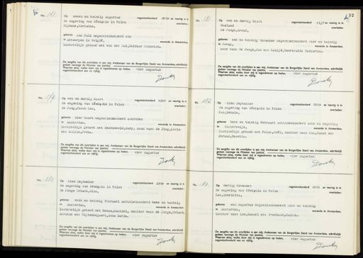 geboren twee en twintig Februari achttienhonderd acht en negentig in Winterswijk, wonende in Amsterdam. laatstelijk gehuwd met Polak, Joël, dochter van: Kan, Jakob en: Straus, Rosetta. De aangifte van dit overlijden is aan mij, Ambtenaar van de Burgerlijke Stand van Amsterdam, schrifteljk gedaan vanwege de Minister van Justltle. — Waarvan akte, welke door mij is ingeschreven op heden, vier Augustus negentienhonderd een en vijftig. Tonte No. 180. Op tien September negentienhonderd drie en veertig is in de omgeving van OSwigcim in Polen overleden: de Jonge Urbach,Dina, venten geboren acht en twintig Februari achttienhonderd twee en tachtig in Amsterdam, wonende in Amsterdam. laatstelijk gehuwd met Reens,Machiel, dochter van: de Jonge,Urbach, Abraham en: Uijtenbogaart, Anna Maria. De aangifte van dit overlijden is aan mij, Ambtenaar van de Burgerlijke Stand van Amsterdam, schriftelk gedaan vanwege de Minister van Justitie. — Waarvan akte, welke door mij is ingeschreven op heden, vier Augustus negentienhonderd een en vijftig. Dorte No. 183. Op dertig November negentienhonderd drie en veertig is in de omgeving van OSwigcim in Polen. overleden: Lam, Henrietta,