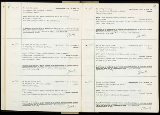 Isaah. 2 geboren twintig Februari achttienhonderd twee en zestig in Rosenberg in Duitsland, wonende in Amsterdam, laatstelijk gehuwd met Neuburger,Adelheid, zoon van: Orzegow, Moritz en: Landsberger, Emma. De aangifte van dit overlijden is aan mij, Ambtenaar van de Burgerlijke Stand van Amsterdam, schrifteljk gedaan vanwege de Minister van Justitie. Waarvan akte, welke door mij is ingeschreven op heden, vier Augustus negentienhonderd een en vijftig. Poot No. 44 Op een en dertig Maart negentienhonderd vier en veertig is in de omgeving van OSwiecim in Polen overleden: Oudkerk, Gerard Jacques,