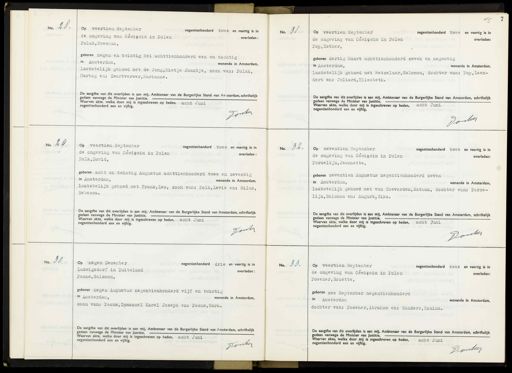 No. 28. Op veertien September negentienhonderd twee en veertig is in de omgeving van Oswigcim in Polen. 11 overleden: Polak, Soesman, 1st Ja. geboren negen en twintig Mei achttienhonderd een en tachtig, in Amsterdam, wonende in Amsterdam, laatstelijk gehuwd met de Jong,Mietje Jaantje, zoon van: Polak, Hartog en: Zwartverwer, Marianne. De aangifte van dit overlijden is aan mij, Ambtenaar van de Burgerlijke Stand van Amsterdam, schriftelijk gedaan vanwege de Minister van Justitie. Waarvan akte, welke door mij is ingeschreven op heden, acht Juni negentienhonderd een en vijftig. Donten No. 31. Op veertien September negentienhonderd twee en veertig is i de omgeving van Oswigcim in Polen overleden: Pop,Esther, 198 geboren dertig Maart achttienhonderd zeven en negentig wonende in Amsterdam, In Amsterdam, laatstelijk gehuwd met Metzelaar, Salomon, dochter van: Pop, Leen- dert en: Juliard, Elisabeth. De aangifte van dit overlijden is aan mij. Ambtenaar van de Burgerlijke Stand van Amsterdam, schriftelk gedaan vanwege de Minister van Justitle. Waarvan akte, welke door mij is ingeschreven op heden, acht Juni- negentienhonderd een en vijftig. Donter No. 49. Op veertien September negentienhonderd twee en veertig is in de omgeving van Oswigcim in Polen- overleden: Polk, David, V geboren acht en twintig Augustus achttienhonderd twee en zeventig wonende in Amsterdam, in Amsterdam, laatstelijk gehuwd met Frank, Lea, zoon van: Polk, Levie en: Silas, Rebecca. De aangifte van dit overlijden is aan mij, Ambtenaar van de Burgerlijke Stand van Amsterdam, schrifteljk gedaan vanwege de Minister van Justitie. Waarvan akte, welke door mij is ingeschreven op heden, acht Juni negentienhonderd een en vijftig. Tonken No. 32. Op zeventien September negentienhonderd twee en veertig is in de omgeving van Oswigcim in Polen overleden: 377 1 Porcelijn, Jeannette, geboren zeventien Augustus negentienhonderd zeven. in Amsterdam, wonende in Amsterdam. laatstelijk gehuwd met van Coevorden,Nathan, dochter van: Porce- lijn, Salomon en: Augurk, Rika. De aangifte van dit overlijden is aan mij, Ambtenaar van de Burgerlijke Stand van Amsterdam, schrifteljk gedaan vanwege de Minister van Justitie. Waarvan akte, welke door mij is ingeschreven op heden, acht Juni negentienhonderd een en vijftig. Doorter Op negen December negentienhonderd drie en veertig is in Ludwigsdorf in Duitsland overleden: Iv: Poons, Salomon,
