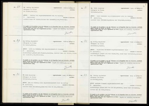 No. 28 Op dertig September negentienhonderd twee en veertig is in OSwiecim in Polen overleden: de Winter, Heintje, 184 geboren dertig Mei negentienhonderd een en twintig in Amsterdam, wonende in Amsterdam, dochter van: de Winter,Nathan en: Ossendrijver, Frederika. De aangifte van dit overlijden is aan mij, Ambtenaar van de Burgerlijke Stand van Amsterdam, schrifteljl gedaan vanwege de Minister van Justitle. Waarvan akte, welke door mij is ingeschreven op heden, negen en twintig September negentienhonderd vijftig. Dooker No. 31 Kn negentienhonderd twee en veertig is in Op twee Augustus OSwigcim in Polen overleden: Wittenburg, Eva, geboren vier December negentienhonderd acht en twintig in Amsterdam, wonende in Amsterdam, dochter van: Wittenburg, Hijman en: Kropveld,Saartje. De aangifte van dit overlijden is aan mij. Ambtenaar van de Burgerlijke Stand van Amsterdam, schrifteljk gedaan vanwege de Minister van Justitie. Waarvan akte, welke door mij is ingeschreven op heden, negen en twintig September negentienhonderd vijftig. donken No. 29 op dertig September negentienhonderd twee en veertig is in OSwigcim in Polen overleden: de Winter, Helena, geboren acht en twintig Mei negentienhonderd twintig, in Amsterdam, wonende in Amsterdam, laatstelijk gehuwd met Plukker, Maurits, dochter van: de Winter, Nathan en: Ossendrijver, Frederika. De aangifte van dit overlijden is aan mij, Ambtenaar van de Burgerlijke Stand van Amsterdam, schriftelijk gedaan vanwege de Minister van Justitie. Waarvan akte, welke door mij is ingeschreven op heden, negen en twintigSeptember negentienhonderd vijftig. Doorten No. 32. Op dertig September negentienhonderd twee en veertig is in OSwiecim in Polen overleden: Wittenburg, Hijman, N geboren negentien November negentienhonderd vier in Amsterdam, wonende in Amsterdam, laatstelijk gehuwd met van Geens,Eva, zoon van: Wittenburg, Salomon en: van Lochem,Eva. De aangifte van dit overlijden is aan mij, Ambtenaar van de Burgerlijke Stand van Amsterdam, schrifteljl gedaan vanwege de Minister van Justitie. — Waarvan akte, welke door mij is ingeschreven op heden, negen en twintig September negentienhonderd vijftig. Donken No. 30. Op twee Augustus negentienhonderd twee en veertig is in OSwiecim in Polen overleden: Uittenburg, Branca, geboren een en twintig Juli negentienhonderd vier en dertig in Amsterdam, wonende in Amsterdam, dochter van: Wittenburg, Izak en: van de Kar,Rebecca. De aangifte van dit overlijden is aan mij, Ambtenaar van de Burgerlijke Stand van Amsterdam, schriftelijk gedaan vanwege de Minister van Justitie. Waarvan akte, welke door mij is ingeschreven op heden, negen en twintig September negentienhonderd vijftig. Dooker No. 33. Op dertig September negentienhonderd twee en. veertig is in OSwiecim in Polen overleden: Wittenburg, Izak, geboren zestien Januari negentienhonderd zes in Amsterdam, wonende in Amsterdam, laatstelijk gehuwd met van de Kar,Rebecca, zoon van: Wittenburg, Marcus en: de Hond,Branca. De aangifte van dit overlijden is aan mij, Ambtenaar van de Burgerlijke Stand van Amsterdam, schriftelijk gedaan vanwege de Minister van Justitie. Waarvan akte, welke door mij is ingeschreven op heden, negen en twintig September negentienhonderd vijftig. Donker