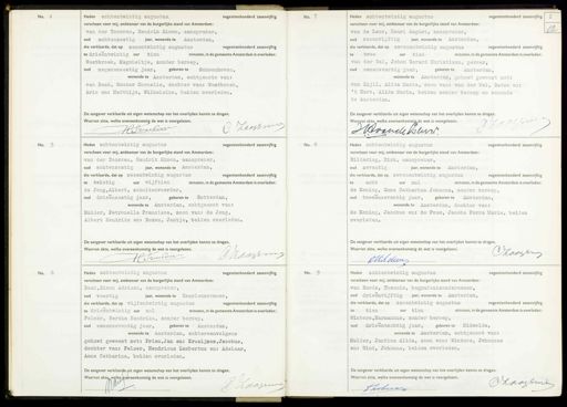 No. 4 Heden achtentwintig augustus, negentienhonderd zesenvijftig verscheen voor mij, ambtenaar van de burgerlijke stand van Amsterdam: van der Toorren, Hendrik Simon, aanspreker, oud achtenzestig jaar, wonende te Amsterdam, die verklaarde, dat op zesentwintig augustus negentienhonderd zesenvijftig te drieentwintig uur tien minuten, in de gemeente Amsterdam is overleden: Westbroek, Magcheltje, zonder beroep, oud negenenzestig jaar, geboren te Schoonhoven, wonende te Amsterdam, echtgenote van: van Beek, Wouter Cornelis, dochter van: Westbroek, Arie en: Matthijs, Wilhelmina, beiden overleden. De aangever verklaarde uit eigen wetenschap van het overlijden kennis te dragen. Waarvan akte, welke overeenkomstig de wet is voorgelezen. C Laagma H Suueborer No. Heden achtentwintig augustus negentienhonderd zesenvijftig 2 verscheen voor mij, ambtenaar van de burgerlijke stand van Amsterdam: 62 van de Leuv, Henri August, aanspreker, oud zesenvijftig jaar, wonende te Amsterdam, die verklaarde, dat op zevenentwintig augustus negentienhonderd zesenvijftig te twee uur tien minuten, in de gemeente Amsterdam is overleden: van der Wal, Johan Gerard Christiaan, perser, oud eenenveertig jaar, geboren te Amsterdam, wonende te Amsterdam, gehuwd geweest met: van Zijll, Alida Maria, zoon van: van der Wal, Gatze en: 't Hart, Alida Maria, beiden zonder beroep en wonende te Amsterdam. De aangever verklaarde uit eigen wetenschap van het overlijden kennis te dragen. Jd Waarvan akte, welke overeenkomstig de wet is voorgelezen. HAvande Bund. No. 5 Heden achtentwintig augustus negentienhonderd zesenvijftig verscheen voor mij, ambtenaar van de burgerlijke stand van Amsterdam: van der Toorren, Hendrik Simon, aanspreker, oud achtenzestig jaar, wonende te Amsterdam, 5 die verklaarde, dat op zesentwintig augustus negentienhonderd zesenvijftig te twintig uur vijftien minuten, in de gemeente Amsterdam is overleden: de Jong, Albert, schuitenvoerder, oud drieënzestig jaar, geboren te Rotterdam, wonende te Amsterdam, echtgenoot van: Mulder, Petronella Francisca, zoon van: de Jong, Albert Hendriks en: Boxem, Jantje, beiden overleden. De aangever verklaarde uit eigen wetenschap van het overlijden kennis te dragen. Waarvan akte, welke overeenkomstig de wet is voorgelezen. DHaagzing H Svabvor No. 8 Heden achtentwintig augustus negentienhonderd zesenvijftig verscheen voor mij, ambtenaar van de burgerlijke stand van Amsterdam: Hildering, Dirk, aanspreker, x oud zeventig jaar, wonende te Amsterdam, die verklaarde, dat op zevenentwintig augustus negentienhonderd zesenvijftig te acht uur nul minuten, in de gemeente Amsterdam is overleden: de Koning, Emma Catharina Johanna, zonder beroep, oud tweeënzeventig jaar, geboren te Amsterdam, wonende te Amsterdam, dochter van: de Koning, Jacobus en: de Fouw, Jacoba Forra Maria, beiden overleden. De aangever verklaarde uit eigen wetenschap van het overlijden kennis te dragen. Waarvan akte, welke overeenkomstig de wet is voorgelezen.