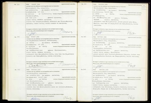 No. 543 Heden twaalf juni negentienhonderd zesenvijftig Ee verscheen voor mij, ambtenaar van de burgerlijke stand van Amsterdam: Meijer, Gerrit Jan, aanspreker, oud zesenveertig jaar, wonende te Amsterdam, negentienhonderd zesenvijftig die verklaarde, dat op elf juni te achttien uur vijfentwintig minuten, in de gemeente Amsterdam is overleden: Grasmeijer,Mies, oud vier jaar geboren te Amsterdam, zonder beroep wonende te Amsterdam, dochter van: Grasmeijer, Roelf, machinist en: Visser,Marretje Anthonia, zonder beroep, beiden wonende te Amsterdam. De aangever verklaarde uit eigen wetenschap van het overlijden kennis te dragen. Waarvan akte, welke overeenkomstig de wet is voorgelezen. Joogmn Cmije 1/ No. 546 Heden dertien juni negentienhonderd zesenvijftig verscheen voor mij, ambtenaar van de burgerlijke stand van Amsterdam: Meijer, Gerrit Jan, aanspreker, Jeb oud zesenveertig jaar, wonende te Amsterdam, die verklaarde, dat op twaalf juni negentienhonderd zesenvijftig te zeven uur dertig minuten, in de gemeente Amsterdam is overleden: de Lange, Klaas. oud drieenvijftig jaar geboren te Oostzaan, werkman wonende te Amsterdam, echtgenoot van: Mooij,Trijntje, gehuwd geweest met: Wals, Neeltje, zoon van: de Lange, Jacob en: Band, Cornelia, beiden overleden. De aangever verklaarde uit eigen wetenschap van het overlijden kennis te dragen. Waarvan akte welke overeenkomstig de wet is voorgelezen. Cmm Hartes No. 544 Heden twaalf juni negentienhonderd zesenvijftig verscheen voor mij, ambtenaar van de burgerlijke stand van Amsterdam: van Es,Anthonius Cornelis, buffethouder, oud dertig jaar, wonende te Aalsmeer, negentienhonderd zesenvijftig ayt A10 geseh die verklaarde, dat op elf juni te vijftien uur dertig minuten, in de gemeente Amsterdam is overleden: 5 van Es, Johannes, oud tweeënzestig jaar geboren te Haarlemmermeer, zonder beroep wonende te Aalsmeer, echtgenoot van: Zaal, Hendrica Maria, zoon van: van Es,Antonius Cornelis en: Kunis,Neeltje, beiden overleden. De aangever verklaarde uit eigen wetenschap van het overlijden kennis te dragen, Waarvan akte, welke overeenkomstig de wet is voorgelezen. Thansmia Dar 6 No. 547 Heden dertien juni negentienhonderd zesenvijftig verscheen voor mij, ambtenaar van de burgerlijke stand van Amsterdam: Meijer, Gerrit Jan, aanspreker, oud zesenveertig jaar, wonende te Amsterdam, die verklaarde, dat op elf juninegentienhonderd zesenvijftig 1 te elf uur nul minuten, in de gemeente Amsterdam is overleden: 1 Bulsing, Maria Gerardina, oud vierentachtig jaar geboren te Amsterdam, zonder beroep wonende te Monnikendam, gehuwd geweest met: Voorvaart, Hermannus Johannes, dochter vane Bulsing, Jacobus Nicolaas en: Bunger, Martha, beiden overleden. De aangever verklaarde uit eigen wetenschap van het overlijden kennis te dragen. Waarvan akte, welke overeenkomstig de wet is voorgelezen. Bunt Cmm No. 545 negentienhonderd zesenvijftig Heden dertien juni verscheen voor mij, ambtenaar van de burgerlijke stand van Amsterdam: Hildering, Dirk, aanspreker, oud zeventig jaar jaar, wonende te Amsterdam, negentienhonderd zesenvijftig die verklaarde, dat op twaalf juni te drie uur dertig minuten, in de gemeente Amsterdam is overleden: ter Braake,Christina, oud drieenzeventig jaar geboren te Amsterdam, zonder beroep wonende te Amsterdam, dochter van: ter Braake, Hendrik Lucas en: Lasonder, Hermanna, beiden overleden. De aangever verklaarde uit eigen wetenschap van het overlijden kennis te dragen. Waarvan akte, welke overeenkomstig de wet is voorgelezen. Woortjs Ailderin No. 548 Heden dertien juni negentienhonderd zesenvijftig verscheen voor mij, ambtenaar van de burgerlijke stand van Amsterdam: Meijer, Gerrit Jan, aanspreker, oud zesenveertig jaar, wonende te Amsterdam, die verklaarde, dat op twaalf juni negentienhonderd zesenvijftig te acht uur dertig minuten, in de gemeente Amsterdam is overleden: Bruns, Johanna Christina, oud vijfenzestig jaar geboren te Amsterdam, zonder beroep wonende te Amsterdam, echtgenote van: Fraterman, Cornelis Johannes, dochter van: Bruns, Jan Jurgen en: de Boer, Lijsbeth, beiden overleden. De aangever verklaarde uit eigen wetenschap van het overlijden kennis te dragen. Waarvan akte, welke overeenkomstig de wet is voorgelezen. Imt Wunt