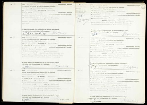 No. NN Heden achttien : negentienhonderd zesenvijftig verscheen voor mij, ambtenaar van de burgerlijke stand van Amsterdam: van de Leuv, Henri August, aanspreker, oud, zesenvijftig jaar, wonende te Amsterdam, die verklaarde, dat op zestien april negentienhonderd zesenvijftig te tien uur nul minuten, in de gemeente Amsterdam is overleden. Brugman, Johanna, zonder beroep, oud drieenzeventig jaar, geboren te Steenwijk, wonende te Amsterdam, dochter van: Brugman, Hendrik en: Weerman, Wijbigje,, beiden overleden. De aangever verklaarde uit eigen wetenschap van het overlijden kennis te dragen. Waarvan akte, welke overeenkomstig de wet t voorgelezen. PZaoghmo HA van de Lein. x No. 31 zevenendertig minuten. Renvooi en de doorhaling v. twee woorden goedgekeurd. C Cs Heden achttien april NE negentienhonderd zesenvyftig 6 verscheen voor mij, ambtenaar van de burgerlijke stand van Amsterdam: 6 Meijer, Gerrit Jan, aanspreker, oud vijfenveertig jaar, wonende te Amsterdam, die verklaarde, dat op zestien april negentienhonderd zesenvijftig te negentien uur -gevend 2t=minuten, in de gemeente Amsterdam is overleden: Deijs, Jurrien, schilder, E oud zevenenveertig jaar, geboren te Amersfoort wonende te Amsterdam, echtgenoot van: Krebs, Aagje Jacoba, zoon van: Deijs, Hendrikus Johannes en: Vastenburg, Cornelia Sophia Dina, beiden overleden. De aangever verklaarde uit eigen wetenschap van het overlijden kennis te dragen. Waarvan akte, welke overeenkomstig de wet is voorgelezen. G Chaaymg No. 29 Heden achttien april negentienhonderd zesenvijftig verscheen voor mij, ambtenaar van de burgerlijke stand van Amsterdam: Meijer, Gerrit Jan, aanspreker, oud vijfenveertig jaar, wonende te Amsterdam, die verklaarde, dat op zeventien adril negentienhonderd zesenvijftig te twee uur nul minuten, in de gemeente Amsterdam is overleden: Heukers, Gerhard, zonder beroep, oud vijfentachtig jaar, geboren te Groningen, wonende te Amsterdam, gehuwd geweest met: Vesper, Johanna Wilhelmina, zoon van: Heukers, Jakob Roelof en: Dreesman, Engelina, beiden overleden. De aangever verklaarde uit eigen wetenschap van het overlijden kennis te dragen. Waarvan akte, welke overeenkomstig de wet is voorgelezen. Drooyring No. 32. Heden achttien april negentienhonderd zesenvijftig verscheen voor mij, ambtenaar van de burgerlijke stand van Amsterdam: Lemkes, Bernardus, begrafenisondernemer, oud vijfenveertig jaar, wonende te Amsterdam. die verklaarde, dat op zestien april negentienhonderd zesenvijftig 5 te drie uur twintig minuten, in de gemeente Amsterdam is overleden: 1 Smit, Theodorus Wilhelmus, zonder beroep, oud vijfenzeventig jaar, geboren te Amsterdam, wonende te Amsterdam, gehuwd geweest met van den Heuvel, Maria Johanna, zoon van: Smit, Elbert en: Jansen, Cornelia, beiden overleden. De aangever verklaarde uit eigen wetenschap van het overlijden kennis te dragen. Waarvan akte, welke overeenkomstig de wet is voorgelezen. Haagma Kamen No. 30 Heden achttien april negentienhonderd zesenvijftig verscheen voor mij, ambtenaar van de burgerlijke stand van Amsterdam: Meijer, Gerrit Jan, aanspreker, oud vijfenveertig jaar, wonende te Amsterdam, die verklaarde, dat op zeventien april negentienhonderd zesenvijftig te tien uur dertig minuten, in de gemeente Amsterdam is overleden: Escherich, Hendrik, zonder beroep, oud zeventig jaar, geboren te Amsterdam, wonende te Amsterdam, echtgenoot van: Volmer, Johanna Maria, zoon van: Escherich, Gerrit en: Kroese, Jozina Johanna, beiden overleden. De aangever verklaarde uit eigen wetenschap van het overlijden kennis te dragen. Waarvan akte, welke overeenkomstig de wet is voorgelezen. Cmp 1 OAdagring No. 33 x Heden achttien april negentienhonderd zesenvijftig verscheen voor mij, ambtenaar van de burgerlijke stand van Amsterdam: Lemkes, Bernardus, begrafenisondernemer, oud vijfenveertig jaar, wonende te Amsterdam, die verklaarde, dat op zestien april negentienhonderd zesenvijftig :te negen uur viftien minuten, in de gemeente Amsterdam is overleden: Anink, Petrus Franciscus; zonder beroep, oud zevenenzeventig jaar, geboren te Amsterdam, wonende te Amsterdam, gehuwd geweest met: Kristel, Johanna Maria, zoon van: Anink, Petrus Franciscus en: Veltman, Anna Maria Christina. De aangever verklaarde uit eigen wetenschap van het overlijden kennis te dragen. Waarvan akte, welke overeenkomstig de wet is voorgelezen. Zaoerma Kentis