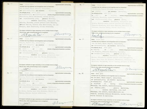 negentienhonderd zevenenvijftig Heden neg. verscheen voor mij, ambtenaar van de burgerlijke stand van Amsterdam van de Leuv, Henri August, aanspreker, oud zevenenvijftig jaar, wonende te Amsterdam, die verklaarde, dat op zeven juli negentienhonderd zevenenvijftig te tweeëntwintig uur vijfenvijftig minuten, in de gemeente Amsterdam is overleden: Kokkelkorn, Maria Elizabeth, zonder beroep, oud negenenzestig jaar, geboren te Heerlen, wonende te Amsterdam, echtgenote van: Huisman, Hendrik, gehuwd geweest met: Gelders, Hubert Willem, dochter van: Kokkelkorn, Jan en: Baadjou, Anna Geertruid, beiden overleden. De aangever verklaarde uit eigen wetenschap van het overlijden kennis te dragen. Waarvan akte, welke overeenkomstig de wet is voorgelezen. Zoogemag HEradeen No. 19 Heden negen negentienhonderd zevenenvijftig verscheen voor mij, ambtenaar van de burgerlijke stand van Amsterdam Houthuijs, August William, aanspreker, oud zestig jaar, wonende te Amsterdam, die verklaarde, dat op acht juli negentienhonderd zevenenvijftig te elf uur vijftig minuten, in de gemeente Amsterdam is overleden: Hakkert, Cornelis, rijwielhersteller, oud vijfenzeventig jaar, geboren te Assen, wonende te Amsterdam, echtgenoot van: Swart, Geertje Anna, gehuwd geweest met: Meints, Fokiena Everdina, zoon van: Hakkert, Cornelis en: Heidema, Jantina Maria, beiden overleden. De aangever verklaarde uit eigen wetenschap van het overlijden kennis te dragen. Waarvan akte, welke overeenkomstig de wet is voorgelezen. OZoogenig Antanstr No. 17 negentienhonderd zevenenvijftig Heden negen juli verscheen voor mij, ambtenaar van de burgerlijke stand van Amsterdam: Meijer, Gerrit Jan,aanspreker, oud zevenenveertig jaar, wonende te Amsterdam, die verklaarde, dat op acht juli negentienhonderd zevenenvijftig te acht uur nul minuten, in de gemeente Amsterdam is overleden: van Vliet, Arie, zonder beroep, oud zevenenzestig jaar, geboren te Leiden, wonende te Amsterdam, echtgenoot van: Ton, Geertje, zoon van: van Vliet, Wilhelmina, overleden. De aangever verklaarde uit eigen wetenschap van het overlijden kennis te dragen. Waarvan akte, welke overeenkomstig de wet is voorgelezen. CZoogemag Pes No. 20 Heden negen juli negentienhonderd zevenenvijftig verscheen voor mij, ambtenaar van de burgerlijke stand van Amsterdam: van de Leuv, Henri August, aanspreker, oud zevenenvijftig jaar, wonende te Amsterdam, die verklaarde, dat op acht juli negentienhonderd zevenenvijftig te twintig uur nul minuten, in de gemeente Amsterdam is overleden: den Blanken, Johannes Cornelis, opperman. oud tweeënvijftig jaar, geboren te de Bilt, wonende te Amsterdam, echtgenoot van: Koeman, Elisabeth, gehuwd geweest met: Mehlgarten, Anna, zoon van: den Blanken, Everardus, overleden en: Michiels, Catharina, zonder beroep, wonende te Houten. De aangever verklaarde uit eigen wetenschap van het overlijden kennis te dragen. Waarvan akte, welke overeenkomstig de wet is voorgelezen. Izoogemeg HEande Cur No. 18 Heden negen juli negentienhonderd zevenenvijftig verscheen voor mij, ambtenaar van de burgerlijke stand van Amsterdam: Meijer, Gerrit Jan, aanspreker, oud zevenenveertig Jaar, wonende te Amsterdam, die verklaarde, dat op acht juli negentienhonderd zevenenvijftig te acht uur nul minuten, in de gemeente Amsterdam is overleden: Pieksma, Eelke, kantoorbediende, oud negenenvijftig jaar, geboren te Harlingen, wonende te Amsterdam, echtgenoot van: de Bruin, Maria, zoon van: Pieksma, Hijlke en: Tadema, Feikje, beiden overleden. De aangever verklaarde uit eigen wetenschap van het overlijden kennis te dragen Waarvan akte, welke overeenkomstig de wet is voorgelezen. CZoogmi Smyn No. 21 Heden tien juli negentienhonderd zevenenvijftig verscheen voor mij, ambtenaar van de burgerlijke stand van Amsterdam: van de Leuv, Henri August, aanspreker, oud zevenenvijftig jaar, wonende te Amsterdam, die verklaarde, dat op negen juli negentienhonderd zevenenvijftig te vijftien uur dertig minuten, in de gemeente Amsterdam is overleden Hennings, Jan Albert, kantoorbediende, oud twintig jaar, geboren te Amsterdam, wonende te Amsterdam, zoon van: Hennings, Jan Albert, kantoorhediende en: Verhoek, Albertha Johanna Elisabeth, zonder beroep, beiden wonende te Amsterdam. De aangever verklaarde uit eigen wetenschap van het overlijden kennis te dragen. Waarvan akte, welke overeenkomstig de wet is voorgelezen. Dhaogrma JandeSur