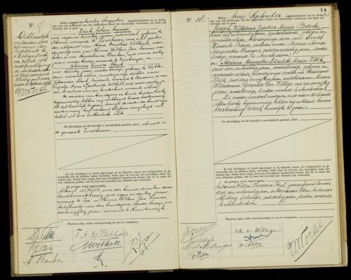 No. 17 Dithuwelijk i ontbonden door het vennis der Rechtbank te S Hertogenbrsch van 21 Juli 1936 en de inschrijving te Amsterdam aan Watergraapmeer¬ de Hulpsecretarie heden 8 September 1936. WWortel Heden negen en twintig Augustus negentienhonderd een en dertig, zijn voor mij Ambtenaar van den burgerlijken Stand van Amsterdam verschenen, ten einde een huwelijk aan te gaan: Dirk Johan Sannes, rid negen en twintig jaren, advocaat, geboren te Hoorn, wonende te Eindhoven, van echt genhei den echtgenoot van Marie Dorotheé Volkersz, meer derjarige zoon van Hinno Willem Jan Sannes over leden, en van Hadelaine Boeken, oud vier en zestig jaren, zonder beroep, wonende te Driebergen; en: Johanna Louise Stark oud twintig jaren, zonder beroep, geboren te Rotter dam, wonende alhier, minderjarige dochter van Johannes Stark, tandarts, wonende te Bursum, en van Trijntje Anna Geertruida Witholt, oud zes en veertig ja- ren, directrice van een kinderhuis, wonende alhier De moeders van bruidegom en bruid, beiden hierbij tegenwoordig, hebben mij verklaard hunne toestemming tot dit huwelijk te geven, terwijl de vader der buuid zijne testemming heeft verleend blijkens overgelegd uit- heksel uit eene cuuthentieke akte. De afkondiging tot dit huwelijk is onverhinderd geschied, alhier, alsmede in de gemeente Eindhoven. Ik heb bruidegom en bruid afgevraagd of zij elkander nemen tot echtgenooten en ge trouwelijk alle de plichten zullen vervullen, welke door de wet aan den huwelijken staat ver bonden zijn. Nadat deze vragen door hen bevestigend beantwoord werden, heb ik, in naam der wet, uitspraak gedaan, dat zij door het huwelijk aan elkander zijn verbonden. Als getuigen waren tegenwoordig Albert Witholt, oom der bruid, directeur eene handelsmaatschappij, oud negen en veertig jaren wonende te Epe, en Hinns Willem Jan Fannes halfbroeder van den bruidesom, zonder beroep, oud een en vijftig jaren, wonende te Haartensdijk No. 18. 10 Heden twee September negentienhonderd een en dertig C zijn voor mij Ambtenaar van den burgerlijken stand van Amsterdam verschenen, ten einde een muwelijk aan te gaan Joseph Wilhelmus Jacobus Maria Baede- oud vijf entwintig jaren, Kantoorbediende, geboren en wonende alhier, meerderjarige zoon van Ernst Hendrik Boede, overleden en van Maria Anna Margaretha Burgers, ouddrie enzestig jaren, zonder beroep, wonende te Amsterdam, in: Adriana Margaretha Elisabeth Maria Valk, oud een en twintig jaren, zonder beroep, geboren en wonende alhier, meerderjarige dochter van Ferdinand Valk, oud drie envyftig jaren winkelier en van Maria Wilhelmina Gerarda van Willige, oud een envijftig jaren, zonder beroep, beiden wonende te Amsterdam. De moeder vanden bruidegom en de ouders der bruid„ allen hierbij tegenwoordig, hebben my verklaard hunne toestemming tot dit huwelijk tegeven. De afkondiging tot dit huwelijk is onverhinderd geschied, alhier. - Ik heb bruidegom en bruid afgevraagd of zij elkander nemen tot echtgenooten en ge trouwelijk alle de plichten zullen vervullen, welke door de wet aan den huwelijken staat ver bonden zijn. Nadat deze vragen door hen bevestigend beantwoord werden, heb ik, in naam der wet, uitspraak gedaan, dat zij door het huwelijk aan elkander zijn verbonden. Als getuigen waren tegenwoordig: Antonius Willem Theodorus Brul, gemeenteambtenaar oud een entwintig jaren en Bernardus Petrus Antonius Heling, behanger, oud dertig jaren, beiden wonende te Amsterdam. Waarvan akte, welke overeenkomstig de wet is voorgelezen. T.A. G. Witholt D SMm -do WWethoet. 8 JC Stank H M Boeken