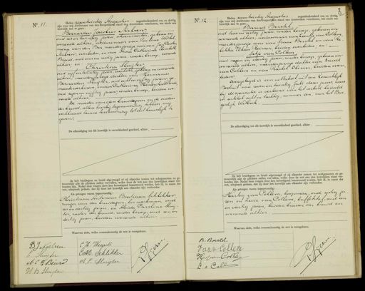 N A. 11 Heden zesen twintig Augustus negentienhonderd een en dertig zijn voor mij Ambtenaar van den Burgerlijken stand van Amsterdam verschenen, ten einde een huwelijk aan te gaan: Bernardus Jacobus Nelsen oud zes en twintig jaren, ahoenmaker, geboren en wonende alhier, weduwnaar van Paulina Wilhel„ mina van den Bos, meerderjarige zoon van Jan Carsten kelsen, overleden, en van Anna Catharina Elisabeth Biard, oud vier en zestig jaren, zonder beroep, wonende alhier; en Christina Sluister oud vijf en twintig jaren, werkster, geboren en wonende alhier, meerderjarige dochter van Hermanus Bernardus Sluijter, oud acht en vijftig jaren, ge meente werkman, en van Catharina Hendrika Wiardi oud negen en vijftig jaren, zonder beroep, beiden wo- IO nende alhier. De moeder van den bruidesom en de ouder der bruid, allen hierbij tegenwoordig, hebben mij verklaard hunne toesemming tot dit huwelijk te geven. De afkondiging tot dit huwelijk is onverhinderd geschied, alhier, Ik heb bruidegom en bruid afgevraagd of zij elkander nemen tot echtgenooten en ge trouwelijk alle de plichten zullen vervullen, welke door de wet aan den huwelijken staat ver bonden zijn. Nadat deze vragen door hen bevestigend beantwoord werden, heb ik, in naam de wet, uitspraak gedaan, dat zij door het huwelijk aan elkander zijn verbonden. Als getuigen waren tegenwoordig: Christiaan Antonius Baskaan Schlikker zwager van den bruidegom, los werkman, oud zes en dertig jaren, en Aleida Carolina Sluij ter, zuster der bruid, zonder beroep, oud een en dertig jaren, beiden wonende alhier. overeenkomstig de wet is voorgelezen. No. 12 Heden zes en twintig Augustus negentienhonderd een en dertig, zijn voor mij Ambtenaar van den burgerlijken stand van Amsterdam verschenen, ten einde een huwelijk aan te gaan: Barend Borstel uid twee en zestig jaren, zonder beroep, geboren en wonende alhier, weduwnaar van Leentje van Collem meerderjarige zoon van Isaac Borstel en van Re bekka Elkan Reimer beiden overleden; en: fetie van Collem oud negen en veertig jaren, zonder beroep, geboren en wonende alhier, meerderjarige dochter van Daiel van Collem en van Rachel Olivier, beiden over overgelegd is een uithreksel uit een Koninklijk leden Besluit van zeven en twintig Juli dezes jaars waar bij dispensatie is verleend van het verbod bedoeld in artikel acht en tachtig, nummer één, van het Bur gerlijk Wetboek. De afkondiging tot dit huwelijk is onverhinderd geschied, alhier, Ik heb bruidegom en bruid algevraagd of zij elkander nemen tot echtgenooten en ge- trouwelijk alle de plichten zullen vervullen, welke door de wet aan den huwelijken staat ver- bonden zijn. Nadat deze vragen door hen bevestigend beantwoord werden, heb ik, in naam der wet, uitspraak gedaan, dat zij door het huwelijk aan elkander zijn verbonden. Als getuigen waren tegenwoordig: Hartog van Collem, koopman, oud zestig ja ren en Levie van Collem, buffetihef, oud een en veertig jaren, beiden broeder der bruid en wonende alhier. Waarvan akte, welke overeenkomstig de wet is voorgelezen. CH. Wiardi B J Kielsen do C CctB. Sektikker v Sluijfers x A C. Huyter A C E Biurd H B Sluijter B- Boortd W.d J aan Collem H van Colle L v Call