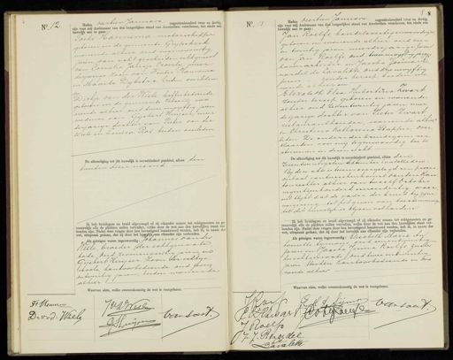 No. 12. 1 Heden veertien Januar negentienhonderd twee en dertig, zijn voor mij Ambtenaar van den burgerlijken stand van Amsterdam verschenen, ten einde een huwelijk aan te gaan; Ioeke Hannemd, motorschipper geboren in de gemeente Gryprkerk wonende alhier, oud negenenveertig jaren van echt gescheiden echtgenoot van Cornelia Jansje Provily meer derjarige zoon van Wouter Hannema, en Maarke Dijkstra beiden overleden en Dirkje van der Wiele, koffiebediende geboren in de gemeente Velsen wo nende alhier oud twee envyftig jaren. weduwe van Gijsbert Huyser, meer derjarige dochter van Pieter van der Wiele en Louisa Ros, beiden overleden De afkondiging tot dit huwelijk is onverhinderd geschied, alhier den tweeden dezer maand Ik heb bruidegom en bruid afgevraagd of zij elkander nemen tot echtgenooten en ge- trouwelijk alle de plichten zullen vervullen, welke door de wet aan den huwelijken staat ver bonden zijn. Nadat deze vragen door hen bevestigend beantwoord werden, heb ik, in naam der wet, uitspraak gedaan, dat zij door het huwelijk aan elkander zijn verbonden. De geduigen waren tegenwoordig: Johannes van der ille broeder der echtgenoote bode oud zevenenveertig jaren en Gijsbert Huijser, zoon der echtge- noote, kantoorbediende oud zeven en twintig jaren, beiden wonende alhier. Waarvan akte, welke overeenkomstig de wet is voorgelezen. No 11. 13 x Heden veertien Januari negentienhonderd twee en dertig zijn voor mij Ambtenaar van den burgerlijken stand van Amsterdam verschenen, ten einde een buwelijk aan te gaan Jan Roelfs, handelsvertegenwoordigen geboren en wonende alhier, oud vier en twintig jaren meerderjarige zoon van Jan Roelfs, oud twee envyftig jaren harenarbeider en Jacoba Jesma Re„ nardel de Lavalette, oud drie envyftig Jaren. — zonder beroep, beiden wo„ nende alhier en Elizabeth Elsa Hubertina Zwart zonder beroep, geboren en wonende alhier, oud zes entwintig jaren, meer op derjarige dochter van Pieter Zwart restanranthouder, wonende alhier en Christina Katharina Stapper, over„ leden De ouders des bruidegoms ver klaarden voor mij tegenwoordig toe te stemmen in desen echt. De afkondiging tot dit huwelijk is onverhinderd geschied, alhier den Zesentwintigsten september laatstleden. Bij deze akte is tevens overgelegd een proces verbaal vantusschenkomst vanden Kan„ tonrechter alhier van twaalf October negentienhonderd eenendertig waar uit blykt dat de vader der bruid bij zijne wergering tot het geven van toestemming tot dit huwelijk is blyven volharden. Ik heb bruidegom en bruid afgevraagd of zij elkander nemen tot echtgenooten en ge- trouwelijk alle de plichten zullen vervullen, welke door de wet aan den huwelijken staat ver- bonden zijn. Nadat deze vragen door hen bevestigend beantwoord werden, heb ik, in naam der wet, uitspraak gedaan, dat zij door het huwelijk aan elkander zijn verbonden. Als getuigen waren tegenwoordig: Elisabeth Maria An toinette tymons, oud eenentwintig jaren en Jacoba Jenna Roelfs, zuster des echtgenoots oud twee entwintig jaren beiden Kantoorbediende en wo nende alhier Waarvan akte, welke overeenkomstig de wet is voorgelezen. T Hunne J vaWiel vansoest. Dr v. d. Wille id GHuyp E.M. J. Lijmn Van vansoert J v oGaeie EHZwar, Wo Roelfo J.J. Rengedel Lavalette