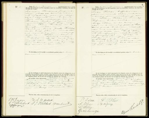 No. 11 Heden dertien Januari negentienhonderd twee en dertig zijn voor mij Ambtenaar van den burgerlijken stand van Amsterdam verschenen, ten einde een huwelijk aan te gaan: Leonardus Hendricus Jurgens slager, geboren en wonende alhier, oud negenentwintig jaren, van acht ge scheiden echtgenoot van Antonia Maria Puite, meerderjarige zoon van Hendricus Jacobus Jurgens, oud negenenzestig arn zonder beroep, wonende 13 alhier en Helena Hendrica van de Genugten, overleden en Carolina Maria Jacoba Helsloot zonder beroep, geboren en wonende alhier oud negenendertig jaren, meerderjarige dochter van: Wilhelmus Adrianus Hironymus Helsloot, overleden en Carolina Stubbe, zonder beroep wonende alhier. De vader des bruide goms verklaarde, voor mij tegenwoordig, toe te stemmen in dezen acht De afkondiging tot dit huwelijk is onverhinderd geschied, alhier den toeeden dezer maand Ik heb bruidegom en bruid afgevraagd of zij elkander nemen tot echtgenooten en ge trouwelijk alle de plichten zullen vervullen, welke door de wet aan den huwelijken staat ver bonden zijn. Nadat deze vragen door hen bevestigend beantwoord werden, heb ik, in naam der wet, uitspraak gedaan, dat zij door het huwelijk aan elkander zijn verbonden. ds getuigen waren tegenwoordig: Wilhelmus Adrianus Hieronymus, Helsloot, oud enen- veertig jaren en Johannes Jacobus Helsloot, oud zesenveertig jaren beiden broeder der echtgenoote, koop- man van beroep en wonende alhier. Waarvan akte, welke overeenkomstig de wet is voorgelezen.- 2 No. 12 8 Heden dertien JJanuari negentienhonderd twee en dertig, zijn voor mij Ambtenaar van den burgerlijken stand van Amsterdam verschenen, ten einde een huwelijk aan te gaan: Pieter Helder, koffiebrander- geboren en wonende alhier, oud zeven. „ entwintig jaren, meerderjarige zoon van: Willem Helder en Trientje Hofman, beiden overleden en Antje Blees, zonder beroep. geboren in de voormalige gemeente Sloten thans gemeente Amsterdam, wonende alhier, oud vierentwintig jaren, meer derjarige dochter van: Dirk Blees oud drieënvijftig jaren, meesterknecht in éen fouragehandel en Grietje de Lange, oud eenenvyftig jaren zonder beroep, beiden wonende alhier. De ouders derbruid verklaarden voor mij tegenwoordig, toete stemmen in dezen echt. De afkondiging tot dit huwelijk is onverhinderd geschied, alhier den tweeden dezer maand. Ik heb bruidegom en bruid afgevraagd of zij elkander nemen tot echtgenooten en ge- trouwelijk alle de plichten zullen vervullen, welke door de wet aan den huwelijken staat ver- bonden zijn. Nadat deze vragen door hen bevestigend beantwoord werden, heb ik, in naam der wet, uitspraak gedaan, dat zij door het huwelijk aan elkander zijn verbonden. Als getuigen waren tegenwoordig: Gerrit Blees broeder der echtgenoote, bankwerker oud eenen twintig jaren en Klaasje de Jong, dienstbode, oud zesentwintig jaren, beiden wonende alhier- Waarvan de wet is voorgelezen. L H Jurgens W. N. U. Glebloot 1 B belsloot I Helsloot van Soest. Gepjargen 1 J Bleer P: Helder. A Blies K de fang. D. Blees.