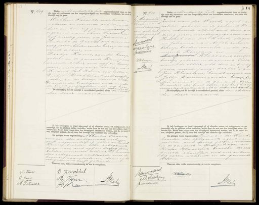 No. 409 Heden acht entwintig Juli negentienhonderd twee en der zijn voor mij Ambtenaar van den burgerlijken stand van Amsterdam verschenen, ten einde g huwelijk aan te gaan: Willem Seiwes, werkman geboren en wonende alhier, oud twee en twintig jaren, meerderja rige zoon van Arie Teiwes, oud wijf enzestig jaren, en Johanna Hendrika de Groot, oud zeven en zestig jaren, beiden zonder beroep en wo„ nende alhier, en Dirkje Kanis, zonder beroep, geboren in de gemeente Kampen, wonende alhier, oud vijf en twintig jaren, meerderjarige dochter van Hendrik Jan Kanis, overleden, en Dirkje Kwakkel, oud acht envyftig jaren, -zonder beroep, wonende alhier De ouders des bruidegoms en de moeder der bruid verklaarden voor mij tegen woordig toe te stemmen in dezen ecpt „ De afkoninging tot dit huwelijk is onverhinderd geschied, alhier den zestien den dezer maand. Ik heb bruidegom en bruid afgevraagd of zij elkander nemen tot echtgenooten en ge trouwelijk alle de plichten zullen vervullen, welke door de wet aan den huwelijken staat ver- bonden zijn. Nadat deze vragen door hen bevestigend beantwoord werden, heb ik, in naam de wet, uitspraak gedaan, dat zij door het huwelijk aan elkander zijn verbonden. Als getuigen waren tegenwoordig: Albertus Visser, zwager des echtgenoots, werkman, oud negenendertig jaren en Hendrik Kanis broeder der echtgenoote koopsvan, oud vijf en dertig jaren. beiden wonende alhier. De moeder des echtgenoots verklaarde niet te kunnen naamteekenen, daar zij het schrijven miet heeft geleerd Waarvan akte, welke overeenkomstig de wet is voorgelezen. 1o 410 14 1„ Magrieta Renvooi en de doorhaling van één geschreven woord goedge¬ keurd. Muent Mklaarsen Jdevend KKlaare Azahy 7 Heden acht entwintig Juli negentienhonderd twee en dertig zijn voor mij Ambtenaar van den burgerlijken stand van Amsterdam verschenen, ten einde een huwelijk aan te gaan: Iwier van der Weerd, agent van politie, geboren in de gemeente Kam pen, wonende alhier, oud twee en dertig jaren, meerderjarige zoon van Hendrik van der Weerd, slager en Johanna van Aefst, zonder beroep, beiden wonende in de ge„ meente Kampen, en Hardrieta Klaassens, zonder beroep, geboren in de gemeente Vries, wonende alhier, oud drie en twintig jaren, meerderjarige dochter van Jan Klaassens, landbouwer en Jeltje Kommer zonder beroep, bei den wonende in de gemeente Assen De ouders der bruid hebben blijkens hierbij overgelegde authentieke akte in dezen echt toegeslemd De afkondiging tot dit huwelijk is onverhinderd geschied, alhier den zAtien den dezer maand. Ik heb bruidegom en bruid afgevraagd of zij elkander nemen tot echtgenooten en ge- trouwelijk alle de plichten zullen vervullen, welke door de wet aan den huwelijken staat ver- bonden zijn. Nadat deze vragen door hen bevestigend beantwoord werden, heb ik, in naam der wet, uitspraak gedaan, dat zij door het huwelijk aan elkander zijn verbonden. Als getuigen waren tegenwoordig: Jan van der Weerd¬ broeder des echtgenoots, agent van politie, oud dertig jaren, wonende in de gemeente 's. Graventrage, en Klaas Klaassens, broeder der echt Genvole, chauffeur, oud vier en hon tig jaren, wonende in de gemeente tezen. Waarvan akte, welke overeenkomstig de wet is voorgelezen. 9 D Kwakkel W. Teiwes. D Kanis. A. Voder AZaky A Terwel H Kam Reewolaris Kkelaarie MKlaaisen AW.Zaky Jolwderd