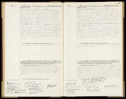 No. 421 Heden vier Augustus negentienhonderd twee en dertig, zijn voor mij Ambtenaar van den burgerlijken stand van Amsterdam verschenen, ten einde een huwelijk aan te gaan: Cornelis Anthonie Renemans, onderwijzer, geboren inde gemeente Apeldoorn wonende alhier, oud vierentwintig jaren, meerderjarige zoon van Peter Renemans, oud vijftig jaren. hoofd eener school, en Henriette Charlotte Johanna Verhoeven, oud vieren vijftig jaren zonder beroep, beiden wonende in de gemeente Holten, en Jefke Cornelia Jacger, zonder beroep geboren enwonende alhier, oud zevenen twintig jaren, meerderjarige dochter van Johan Joseph Jacger, oud acht enviftig jaren, assuradeur, en Jefke lornelia Mulder, oud eenenzestig jaren, zonder beroep, beiden wonende alhier Beider ouders verklaarden, voor mi tegenwoordig, toe te stemmen in dezen echt De afkondiging tot dit huwelijk is onverhinderd geschied, alhier den drieen twintigsten Juli laatstleden Ik heb bruidegom en bruid afgevraagd of zij elkander nemen tot echtgenooten en ge trouwelijk alle de plichten zullen vervullen, welke door de wet aan den huwelijken staat ver bonden zijn. Nadat deze vragen door hen bevestigend beantwoord werden, heb ik, in naam der wet, uitspraak gedaan, dat zij door het huwelijk aan elkander zijn verbonden. Als getuigen waren tegenwoordig: Cornelis Johannes Jacger, broeder der echtgenoote, kapper, oud zesendertig jaren, wonende alhier en Johannes Renemans, broeder des echtgenoots, onderwijzer, oud vifentwin tig jaren, wonende indegemeente Enschede. Waarvan akte, welke overeenkomstig de wet is voorgelezen. No. 438 Heden vier Augustus negentienhonderd twee en dertig, zijn voor mij Ambtenaar van den burgerlijken stand van Amsterdam verschenen, ten einde een huwelijk aan te gaan: Gerard Hilbertus van Veen, tweede officier bij de Kweekschool voor de zeevaartgeboren in de gemeente Beilen, wonende alhier, oud negenentwintig jaren meerder jarige zoon van Willem van Veen, oud vijfenviftig jaren, - hoofd eener schoolen Grietje Tots, oud zesenvijftig jaren; zonder beroep, beiden wonende indegemeente Ruinerwold, en Margaretha Dusanna Catharina Rijnbende, zonder beroep, geboren enwonende alhier, oud dertig jaren, meerderjarige dochter van Nicolaastionard Rijnbende, en Margaretha Ousanna Catharina Bartels, beiden zonder beroep en wonende in de gemeente Velsen, De ouzers desbruidegoms hebben, voor mij tegenwoordig, verklaard toe te semmen indezen echt. De afkondiging tot dit huwelijk is onverhinderd geschied, alhier en indegemeente Ruinervold, denzestienden Juli laatstleden Ik heb bruidegom en bruid afgevraagd of zij elkander nemen tot echtgenooten en getrouwelijk alle de plichten zullen vervullen, welke door de wet aan den huwelijken staat verbonden zijn. Nadat deze vragen door hen bevestigend beantwoord werden, heb ik, in naam der wet, uitspraak gedaan, dat zij door het huwelijk aan elkander zijn verbonden. Als getuigen waren tegenwoordig: Nicolaas Leonard Rijnbende vader der echtgenoote, oud achtenvyftig jaren. Margaretha Susanna Catharina Bartels, oud zevenenvyftig jaren, moeder der echtgenoote, beidenzonder beroep en wonende indegemeente Velser Antje van Veen, zuster desechtgenoots, onder. wijzeres, oud drieendertigaren, wonende al hier, en Klaas van Veen broeder des echtgenoot tanidarts, oud zesentwintig jaren, wonende indegemeente Meppel Waarvan akte, welke overeenkomstig de wet is voorgelezen. Aan dberemant. Joh J Joeger omm J C Abulder UJeegoe Cort Jacqu NEenen oom H.C J. Wenshoer N.L. Rinlonde M P. C. Bartels. G.J. van Veen. FCrommmels A:. van Veen M.S.C. Rijnbende K van Veen Woteen G Pots.