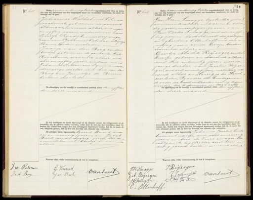 No. 615 Heden zeven entwintig dito bet negentienhonderd twee en dertig, zijn voor mij Ambtenaar van den burgerijjken stand van Amsterdam verschenen, ten einde een huwelijk aan te gaan: Johannes Wilhelmus Polman machinst, geboren in de gemeente Alkmaar, wonende alhier, oud negen en vijftig jaren, weduwwaar van Grietje Rijsdijk, meerderjarige zoon van Johannes Polman en Trijntje Stam, beiden overleden, en Jaapje van den Berg, zonder beroep, geboren in de gemeente Oud- Beijerland, wonende alhier, oud vier en vijftig jaren, weduwe van Johannes Ludovicus Lijmons, meer, derjarige dochter van tre van den Berg en Jannetje de Bruin, beiden overleden.— De afkondiging tot dit huwelijk is onverhinderd geschied, alhier den vijftien den dezer maand Ik heb bruidegom en bruid afgevraagd of zij elkander nemen tot echtgenooten en ge- trouwelijk alle de plichten zullen vervullen, welke door de wet aan den huwelijken staat ver bonden zijn. Nadat deze vragen door hen bevestigend beantwoord werden, heb ik, in naam der wet, uitspraak gedaan, dat zij door het huwelijk aan elkander zijn verbonden. Als getuigen waren tegenwoordig: Gerrit Kwant, oud zes en veertig jaren, en Jacob Beek, oud vijftig jaren, beiden vuurstoker van berdep en wonende alhier. Waarvan akte, welke overeenkomstig de wet is voorgelezen. No. 616 19 Heden zeven entwintig Catober negentienhonderd twee en dertig, zijn voor mij Ambtenaar van den burgerlijken stand van Amsterdam verschenen, ten einde een huwelijk aan te gaan: Jan Harm Smagge, tegelzetter, geboren en wonende alhier, oud zeven en twin„ tig jaren, meerderjarige zoon van- Jan Pieter Smag ge, oud vierenvijf„ tig jaren, kantoorknecht der posterijen en Egberdma Ottenhoff, oud drie en vijftig jaren, zonder beroep, beiden wonende alhier, en Geertje Alida Reyseger, zonder beroep, geboren en wonende alhier, oud drie entwintig jaren, meerder- jarige dochter van Jacobus Reijse- ger, oud acht enveertig jaer, metselaar wo¬ nende alhier en Marrigje ter Horst, overleden. De ouders des bruidegoms en de vader der bruid verklaarden voor mij tegen„ woordig, toe te stemmen in dezen echt. De afkondiging tot dit huwelijk is onverhinderd geschied, alhier den vijftien den dezer maand Ik heb bruidegom en bruid afgevraagd of zij elkander nemen tot echtgenooten en ge- trouwelijk alle de plichten zullen vervullen, welke door de wet aan den huwelijken staat ver- bonden zijn. Nadat deze vragen door hen bevestigend beantwoord werden, heb ik, in naam der wet, uitspraak gedaan, dat zij door het huwelijk aan elkander zijn verbonden. Als getuigen waren tegenwoordig: Johannes Jacobus Smits, brievenbesteller, oud acht enveertig jaren, en trie de Vries, zwager des echtgenoots, tegelzetter, oud twee en dertig jaren, beiden wonende alhier. Waarvan akte, welke overeenkomstig de wet is voorgelezen. JW Polman G. Kwant. van soest J v de Berg J v Bak J Beijseger J. HOmagge J. Jchriit vansoest. J. A. Regoeger Ht tn J P.Mmragje Pa Ottenhoff