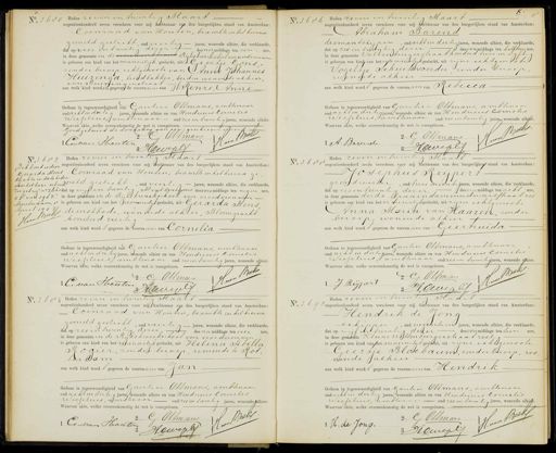 No. 3680 0 Heden zeven en twintig Maart negentienhonderd zeven verscheen voor mij Ambtenaar van den burgerlijken stand van Amsterdam: Coenraad van Houten, beambte in het hurna gemeld gesticht, oud veertig jaren, wonende alhier, die verklaarde dat op vier en twintig dezer desnamiddags ten een ure, in deze gemeente in de vrouwinklinut Rijkskwerkschoot voor vroedvrouwen is geboren een kind van het mannelijk geslacht, uit Geertie Gons. zonder beroep, echtgenoote van Anne Johannes Huizinad, broodbakker, beiden wonende alhier, van Buiningenstraat vij aan welk kind worden gegeven de voornamer van Renze Anne Gedaan in tegenwoordigheid van Cautier Oltmans, amtinaar oud acht en dertig jaren, wonende alhier en van Hendriuus Cornelis Wesselius, ambtenaar oud zes en twintig jaren, wonende alhier. Waarvan akte, welke overeenkomstig de wet is voorgelezen. Goedgekeurd de doorhaling van eengeschreven aoor n t G Oltmans Ce van Houten 2 No. 3686 Heden zeven en twintig Maart negentienhonderd zeven verscheen voor mij Ambtenaar van den burgerlijken stand van Amsterdam: Abraham Barend diamantslijper, oud achten dertig jaren, wonende alhier, die verklaarde, dat op zes en twintig dezer desvoormiddags ten half twee ure, in deze gemeente Valkenburgerstraat honderd twee en vijftig is geboren een kind van het vouverlijkgeslacht, uit zijne echtgenoote Vogeltje Schuitevoerder zonder beroep, wonende alhier van welk Kid wordt gegeven de voornam van Reboeca Gedaan in tegenwoordigheid van Gautier Oltmans, ambtenaar oud achten dertig jaren, wonende alhier en van Hendricus Cornelis Wesselius, ambtenaar oud zes en twintig jaren, wonende alhier. Waarvan akte, welke overeenkomstig de wet is voorgelezen. Bet 2G Oltmans
