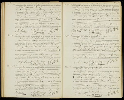 No. 375 1 Heden negen en twintigg Maart negentienhonderd Geven verscheen voor mij Ambtenaar van den burgerlijken stand van Amsterdam: Johannes Bossmann timmerman, oud zeven en twintig jaren, wonende alhier, die verklaarde dat op acht en twintig dezer des voormiddags ten halff zever uure, in deze gemeente Tagelstraat een en twintig is geboren een kind van hetvrouwelijkgeslacht, uit zijne echtgenoote Trijntie van Steenes, zonder beroep wonende alhier aan welk kind wordengegeven de voornamen van Johanna Geertruidd Gezina Gedaan in tegenwoordigheid van Gautiur Oltmans, ambtenaar oud acht en dert jaren, wonende alhier en van Hendriuu Cornelis Wesselius, ambtinaar oud zes en twinti jaren, wonende alhier. Waarvan akte, welke overeenkomstig de wet is voorgelezen. Beek G Oltman Hoon P. Bossmaren HC Wesseli No. 3758 Heden negen en twintig Maart negentienhonderd zeven verscheen voor mij Ambtenaar van den burgerlijken stand van Amsterdam Josephus Bernardus Maria de Greeve winkelier, oud negen entwinti Jjaren, wonende alhier, die verklaarde dat op acht en twintig dezer, des voormiddags ten half twacare in deze gemeente Overtoom tweehonderd zeven en negentig is geboren een kind van het vrouwelijkgeslacht, uit zijne echtgenoote Maria Anna Johanna Pijleman, zon der beroep, wonende alhier aan welk kind worden gegeven de voornamen van Juliana, Johanna Maria Gedaan in tegenwoordigheid van Gautiur Oltmans, ambtenaar oud acht en dertigjaren, wonende alhier en van Hendricus Cornelis Wisselius ambtenaar oud zes en twintig jaren, wonende alhier. Waarvan akte, welke overeenkomstig de wet is voorgelezen. t Womde Geve 2G OltmanJ „ HCWeself No. 3754 Heden negen en twintig Paart negentienhonderd (Zeven verscheen voor mij Ambtenaar van den burgerlijken stand van Amsterdam. Jacobus Johannes Arens werkman, oud twee enveertig jaren, wonende alhier, die verklaarde dat op zeven en twintig dezer desna middags ten vier ure in deze gemeente derde Kattenburgerdwarsstraat elf is geboren een kind van bet vrouwelijk geslacht, uit zijne echtgenoote Bregitta van Berkum, zonder beroep, wonende alhier aan welk kind worden gegeven de voornamen van Hendrika Elisabeth Gedaan in tegenwoordigheid van Gautier Oltmans, ambtenaar oud acht en dertig jaren, wonende alhier en van Hendricus Cornelis Wesselius ambtenaar oud zes en twintig jaren, wonende alhier. Waarvan akte, welke overeenkomstig de wet is voorgelezen. L J J Ariend G Oltmans HC Wesel No. 3760 Heden negen en twintig Maart negentienhonderd zeven verscheen voor mij Ambtenaar van den burgerlijken stand van Amsterdam: Johanna Mekenkamp vroedvrouw, oud zeven en veertig jaren, wonende alhier, die verklaarde dat op zes entwintig dezer desna middags ten een ure in deze gemeente Lynbaanaarachthonderd viftig, in haar bijni is geboren een kind van het vrouwelijk geslacht, uit Sara Elisa deth Smit zonder beroep, wonende alhier, zyn baag grachthonderd vijftig, echtgenoote van Barend Evert Buhr, wiens beroep en woonplaats onbekendry„ van welk kind vordergegeven de voornamerven Wilhelmina Sophsa Gedaan in tegenwoordigheid van Cautur Ottmans, ambtenaar oud acht en derti jaren wonende alhier en van Hendricus Cornelis Wesselius, ambtinaar oud zes en twinti jaren, wonende alhier. Waarvan akte, welke overeenkomstig de wet is voorgelezen. Bek 2 G Ultman Lo 1 S Mekenkamp. 3 HC Wesels No. 1756 6 Heden negen en twintig Haar„ negentienhonderd (Geven verscheen voor mij Ambtehaar van den burgerlijken stand van Amsterdam: Franciscus Kerker maaarijnknecht, oud vijf entwintig jaren, wonende alhier, die verklaarde dat op zeven en twintig dezer desnamiddags ten tien ure in deze gemeente van Boetselaerstaat een is geboren een kind van het vrouwelik geslacht, in zijne echtgenoote Carolina Jacoba Schumacher zonder beroep, wonende alhier aan welk kind wordengegeven de voornamen van Francisca, Carolina Jacoba Gedaan in tegenwoordigheid van Gautier Oltmans, ambtenaar oud achtendertig jaren, wonende alhier en van Hendricus Cornelis Wesseluus, ambtenaar oud zes en twintijjaren, wonende alhier. Waarvan akte, welke overeenkomstig de wet is voorgelezen. . 2G Oltmans F. Kerken lleeezl No. 3762 Heden negen en twintig Maart 2negentienhonderd zeven verscheen voor mij Ambtenaar van en burgerlijken stand van Amsterdam: Cornelis Heurts metaalbewerker, oud acht en dertijjaren, wonende alhier, die verklaarde, dat op acht en twintig dezer des na middags ten drie ure, in deze gemeente Passeerdergracht negen. is geboren een kind van het mannelijk geslacht, uijt zijne echtgenoote Elida Marcaretha Brassem, zonder beroep, wonende alhier aan welk kind worden gegeven de voornamenan Willem, Cornelis Gedaan in tegenwoordigheid van Gautiur Ottmans, ambtenaar oud acht en dertijaren, wonende alhier en van Hendricus Cornelis Wesselius, ambtnaar oud zes entwintigjaren, wonende alhier. Waarvan akte, welke overeenkomstig de wet is voorgelezen. Hen Bt G Oltman 1 C Geurt 3HCWasely
