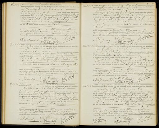 No. 3764 4 Heden negen en twintig Maart negentienhonderd zeven verscheen voor mij Ambtenaar van den burgerlijken stand van Amsterdam Hendrik van Leeuwen ketelmaker, oud vijf entwintig jaren, wonende alhier, die verklaard dat op acht en twintig dezer desna middags ten vijk ur in deze gemeente Kleine Wittenburgerstraat zeven en tachtig is geboren een kind van hetmannelijk geslacht, uit zijne echtgenoote Elsina Petronella Bostdorp, zonder beroep, wonende alhier aan welk kind wordt gegeven de voornaam van Dirk Gedaan in tegenwoordigheid van Gautier Oltmans, amstenaar oud acht en dertig jaren, wonende alhier en van Hendricus Cornelis Wesselius ambtenaar oud zes en twintig jaren, wonende alhier. Waarvan akte, welke overeenkomstig de wet is voorgelezen. Beek 8 G Oltman H van Leeuwen 1 HC Wesels No. 3770 15 Heden negen en twintig Maart negentienhonderd zeven verscheen voor mij Ambtenaar van den burgerlijken stand van Amsterdam: Sloremundus Jansz diamantslijper, oud vijf en dertig jaren, wonende alhier, die verklaarde, dat op acht en twintig dezer des namiddags ten vier ure in deze gemeente Bentinckstraat vyf en veertig is geboren een kind van het mannelijk geslacht, uit zijne echtgenoote Inna Maria van Dorkuld, zonder beroep, wonende alhier aan welk kind worden gegeven de voornamen van Wilhelmus, Bernar dus Gedaan in tegenwoordigheid van Gautier Oltmans, amstenaar oud acht en dertiaren, wonende alhier en van Hendricus Cornelis Westeluus ambtenaar oud zes entwinti Jaren, wonende blhier. Waarvan akte, welke overeenkomstig de wet is voorgelezen. S. 2G Oltman H Juniz HeWessel No. 3767 t Heden negen en twintig Mlaart. negentienhonderd even verscheen voor mij Ammbtenaar van den burgerlijken stand van Amsterdam: Johannes Haber zadelmaker, oud dertig jaren, wonende alhier, die verklaarde dat op zes en twintig dezer desna middags ten elf ure in deze gemeente Polanenstraat zeventig- is geboren een kind van hetvrouwelijk geslacht, uit zijne echtgenoote Geertruida Margaretha Bakker, zon der beroep, wonende alhier aan welk kind wordengegeven de voornamen van Anna, Margaretha Gedaan in tegenwoordigheid van Gautier Ottmans, ambtenaar oud acht en dertig jaren, wonende alhier en van Hendricus Cornelis Wesseliurs, ambtinaar oud zes en twinti jaren, wonende alhier. Waarvan akte, welke overeenkomstig de wet is voorgelezen. H. Mot 2G Oltman Jnaber HCWesselis No. 3772 Heden negen en twintig Haart negentienhonderd even verscheen voor mij Ambtenaar van den burgerlijken stand van Amsterdam: Inthony Gerardus van Dam banketbakker, oud twee endertig jaren, wonende alhier, die verklaarde dat op acht en twintig dezer des na middags ten zeven ure, in deze gemeente Westerstraat 227 is geboren een kind van het vrouwelijk geslacht, uit zijne echtgenoote Frederika Margaretha van Beuse chem, zonder beroep, wonende alhier aan welk kind wordengegeven de voornamen van Sofia, Margaretha Gedaan in tegenwoordigheid van Cautier Oltmans, ambtinaar oud acht en derti jjaren, wonende alhier en van Hendricus Cornelis Wesselius ambtenaar oud zes en twintig jaren, wonende alhier. Waarvan akte, welke overeenkomstig de wet is voorgelezen. Nete 2G Oltma