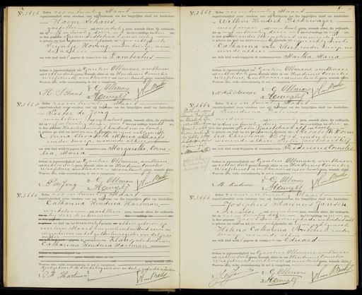 fo. 3651 Heden zes en twintig Maart negentienhonderd zeven verscheen voor mij Ambtenaar van den burgerlijken stand van Amsterdam: Harm Schans, gasfitter, oud eenen dertig jaren, wonende alhier, die verklaarde, dat op vijf en twintig dezer des namiddags ten tien ure, in deze geneente Reinwardtstraat een en resti is geboren een kind ten betmannelijk geslacht, uit zijne echtgenoote Trijntje Hoving, zonder beroep, wonen de alhier aan welk kind wordt gegeven de voornaam van Lambertus Gedaan in tegenwoordigheid van Cautier Oltmans, ambtenaar oud acht en dertig jaren, wonende alhier en van Hendricu Cornelis esselius, ambtenaar oud zes en twintig jaren, wonende alhier. Waarvan akte, welke overeenkomstig de wet is voorgelezen. J. G Oltman H SchansG lephf No. 3662 Heden zes en twintig Maart negentienhonderd zeven verscheen voor mij Ambtenaar van den burgerlijken stand van Amsterdam: Willem Hendrik Dirkzwager werkman, oud vier en twintig jaren, wonende alhier, die verklaarde, dat op vijf en twintig dezer des namiddags ten vijf ure, in deze gemeente van der Hoopstraat een en zestig is geboren een kind van het vrouwe blijfgeslacht, uit zijne echtgenoote Catharina van Vliet, zonder beroep, wo nende alhier aan welk kind wordengegeven de voornamen van Martha, Maria Gedaan in tegenwoordigheid van Eautier Oltmans, ambtenaar oud achten dertig jaren, wonende alhier en van Hendricus Cornelis Wisselius, ambtenaar, oud zes en twintigjaren, wonende alhier. Waarvan akte, welke overeenkomstig de wet is voorgelezen. Men et G. Oltmar W.H. Dirkzwager H. verplaf No. 3658 p Heden zes en twintig Mlaart negentienhonderd zeven verscheen voor mij Ambtenaar van den burgerlijken stand van Amsterdam: Pieter de Jong winkelier oud negen entwintig jaren, wonende alhier, die verklaarde dat op vif en twintig dezer des na middags ten acht ure, in deze gemeente Haarlemmerdijk honderd vier en twintig is geboren een kind van hetvrouwelijk geslacht, uit zijne echtgenoote Anna Elisabeth Maria Schaafs zonder beroep, wonende alhier aan welk kind worden gegeven de voornamen van Aargaretha, Corne¬ lia, Maria Gedaan in tegenwoordigheid van Cautier Oltmans, ambtenaar oud aehs en dertijaren, wonende alhier en van Hendricus Cornelis Wesselius, ambtenaar oud zesentwintig jaren, wonende alhier. Waarvan akte, welke overeenkomstig de wet is voorgelezen. S S 2G Ottman PouJing 3 HCWesely No. 3664 „Dit kind is door Cornelis Berkhout en Elisabeth Cor¬ „nelia Christina & Boers, bij akte op heden gerkend 1 Zie Geb Reg. 11 fo 99. Amsterdam den 17 Juni 1907. Mienarechella a humd te Combrg Heden zes en twintig Maart negentienhonderd zeven verscheen voor mij Ambtenaar van den burgerlijken stand van Amsterdam: Brondiena Datema „ vroedvrouw, oud eenenveertig jaren, wonende alhier, die verklaarde ia dat op drie en twintig dezer des namiddags ten drie ure, p in deze gemeente Pieter Jacobstraat elf, in haar bizijn is geboren een kind van het mannelijk geslacht, uit Elisabeth Corne „lia Christina Boers, zonder beroep wonende alhier, Pieter Jacobstaat elf aan welk kind worden gegeven de voornamen van Fredericus, Cornelis Gedaan in tegenwoordigheid van Gautier Oltmans, ambtinaar oud acht en dertig jaren, wonende alhier en van Hendricus Cornelis Wesselius ambtnaar oud zes en twintijaren, wonende alhier. Waarvan akte, welke overeenkomstig de wet is voorgelezen. C G Oltman B. Datema. 3 H.C Wesslif No. 3660 Heden zes en twintig Maar, negentienhonderd zeven verscheen voor mij Ambtenaar van den burgerlijken stand van Amsterdam: Catharina Hendrica Hartman, werkster, oud achttien jaren, wonende alhier, die verklaarde, ter bij deze te erkennen desmiddags ten ure, in dene gencente in geboren een kind van het mannelik geslacht, uit alhier geboren op veertien Maart negentienhonderd zeven en ingeschreven in het geboortenregister van dat jaar onder vuggod gegeven de voornaam van Klaas, als kind van Catharina Hendrica Hartman bedoen in tegenwoordigheid van ed jaren, wonende alhier en van jaren, wonende alhter. Waarvan akte, welke overeenkomstig de wet is voorgelezen. Goedgekeurd de doorhaling van een en dertig gedriekte woorden 1 CH Hartman Han Bek No. 3666 Heden zeven en twintig Paart 6negentienhonderd zeven verscheen voor mij Ambtenaar van den burgerlijken stand van Amsterdam: Josephus Marinus Jansen orrector, oud negentien jaren, wonende alhier, die verklaarde dat op zes en twintig dezer des voommiddags ten zeven ure, in deze gemeente Jacob van Lennepkade vierhonderd acht is geboren een kind van het mannelykeslacht, uit zijne echtgenoote Helena Catharina Vontsteen, zonder beroep, wonende alhier aan welk kind wordt gegeven de voornaam van Eduard- Gedaan in tegenwoordigheid van Ecutier Oltmans, ambtenaar oud acht en dertigaren, wonende alhier en van Hendricus Cornelis Wesselius ambtinaar oud zes en twintigaren, wonende alhier. Waarvan akte, welke overeenkomstig de wet is voorgelezen. Bek Ad Jann 2G Oltmans Hoal HCWeself
