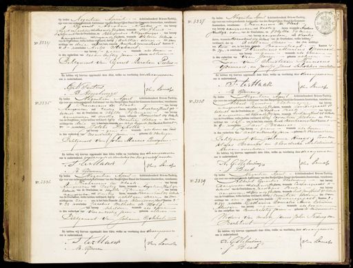 No 3334 Op heden Negentien April. Achttienhonderd drie en-tachtig, zijn voor ons ondergeteekende Ambtenaar van den Burgerlijken Stand der Gemeente Amsterdam, verschenen: Gerrit Abraham Pieters van beroep Agent van politie oud drie envijftig Jaren, wonende sterfhuis.— Ecntgenoot van de Overledene, en Bernardus Niggebrugge van beroep aanspreker oud negen en viftig Jaren, wonende als boven bekende.- van de Overledene, welke hebben verklaard, dat op achttien dezer des voor middags ten drie ure, i het huis, staande Buitenlrouwerstraat Kanton 4. No. 8-, is overleden Antje Strobant van beroep geen wonende als boven in den ouderdom van zes en vyftig jaren - geboren alhier. Ochtgenoot van Gerrit Abraham Peeters. En hebben wij hiervan opgemaakt deze Akte, welke na voorlezing door de aangevers en ons is onderteekend. G: H: Peeters van Lenreps B. Biggeburgge No. 3337 P Op heden Negentien April Achttienhonderd drie en-Tachtig, 1 zijn voor ons ondergeteekende Ambtenaar van den Burgerlijken Stand der Gemeente 35 Amsterdam, verschenen: Francisius ter blaak. 50G van beroep aanspreker oud zestig Jaren wonende Anseliurs G P5 van beroop aangereken oud veertig o strakt 192. oom van de Overledene, en Hylke Tileman- ANE Jaren, wonende Rozeustraat 184 bekend van de Overledene, welke hebben verklaard, dat op Achttien dezer des na middags ten twee ure, in het huis, staande Boomstraat Kanton 4 No. 79-, is overleden Hendricus Marius Izerraad van beroep — geen wonende als boven in den ouderdom van Vier Jarin geboren alhier. zoon van Christiaan Franciscus Yzerraad, en Jantje Jans Schokker overleden En hebben wij hiervan opgemaakt deze Akte, welke na voorlezing door de aangeziers en ons is onderteekend. Dierttaak van Lemeps No. 3335 B. Nl. Op heden Negentien April Achttienhonderd Drieen-Tachtig, zijn voor ons ondergeteekende Ambtenaar van den Burgerlijken Stand der Gemeente Amsterdam, verschenen: Franciocus ter Haak. van beroep Aanspreker oud zestig Jaren, wonende Anjeliersstraat 192.- bekende van de Overledene, en zylke Tyleman van beroep aanspreker oud veertig Jaren, wonende Roseustraat 184 bekende van de Overledene, welke hebben verklaard, dat op zeventien dezer des na middags ten drie ure, in het huis staande een schijp liggende Oosterdok Kanton 1— No., is overleden Letske Dijkstra.- van beroep geen wonende als boven aan boord in den ouderdop van zesenveertig jaren geboren te Harlingen Echtgenoot VanJohan Marius Lindgren.- En hebben wij hiervan opgemaakt deze Akte, welke na voorlezing door de aangevers en ons is onderteekend. goedkeurende de doorhaling van vier gedrukte woorden SEerHaak Van Semees ieman No. 3338 H. Op heden Negentien April Achttienhonderd Drieen-Tachtig, zijn voor ons ondergeteekende Ambtenaar van den Burgerlijken Stand der Gemeente Amsterdam, verschenen: Albert Gerardus Helmzing van beroep aanspreken oud drie en vyftig Jaren, wonende Loouers gracht 11 bekende van de Overledene, en Jacobus Beek van beroep aanspreken oud twee envyftig Jaren, wonende Sint jansstraat 45 bekende van de Overledene, welke hebben verklaard, dat op zeventien dezer des na middags ten elf- ure, in het huis, staande Eerste Boerhaavestraat Kanton 1 No. 9-, is overleden Jan Bramer. van beroep geen wonende als boven in den ouderdom ten acht en zeventig Jaren geboren te Vriesenveen Echtgenoot Van Johanna Kruijs.- zoon van klaas Bramer en Hendrika Aalderink beiden overleden. En hebben wij hiervan opgemaakt deze Akte, welke na voorlezing door de aangevers en ons is onderteekend. van Sermep A. G. Helmsing Beek No. 3336 Op heden Negentien April Achttienhonderd drie en Tachtig, zijn voor ons ondergeteekende Ambtenaar van den Burgerlijken Stand der Gemeente Amsterdam, verschenen: Krancisius ter zaak. van beroep Aanspreker oud zestig Jaren, wonende Anjeliersstraat 192 bekende van de Overledene, en zykke Tijleman. van beroep aanspreker oud veertig Jaren, wonende Rozenstraat 184 bekende van de Overledene, welke hebben verklaard, dat op achttien dezer des voor middagsten zes ure, in het huis, staande Eerste Bloemdwarsstraat Kanton 3 No. 23, is overleden Jacobus Wilhelm de Wolp. van beroep schilder wonende als boven in den ouderdem van vier enzestig jaren- geboren alhier- Echtgenoot Van Johanna Gokkel. 1 En hebben wij hiervan opgemaakt deze Akte, welke na voorlezing door de aangevers en ons is onderteekend. I Eerstaep van Lernek M. Tijleman No. 3339 Negentien April. - Achttienhonderd Drie en-Tacftig Op heden zijn voor ons ondergeteekende Ambtenaar van den Burgerlijken Stand der Gemeente Amsterdam, verschenen: Albert Gerardus Helmsing van beroep aanspreker oud drie envijftig Jaren, wonende Looersgracht 11— bekende van de Overledene, en Jacobus Beek. van beroep aanspreker oud twee en vyftig Jaren, wonende Sint Jansstraat 45 bekende van de Overledene, welke hebben verklaard, dat op zeventien dezer des voor middags ten een ure, in het huis, staande Keizersgracht Kanton 2, No. 532, is overleden- Catharina Cornelia Anna Everdina Alervijn van beroep geen wonende als boven in den ouderdom van Eenenzestig jaren geboren te Dendermonde Weduwe Van Meester James John Teding van Berkhout En hebben wij hiervan opgemaakt deze Akte, welke na voorlezing door de aangevers en ons is onderteekend. H. G. Holmsing Van Lemeps C Beek