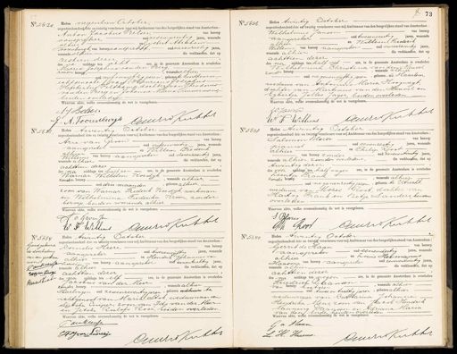 No. 5620 Heden negentien October, negentienhonderd drie en twintig verschenen voor mij Ambtenaar van den burgerlijken stand van Amsterdam: Anton Jacobus Belser, van beroep aanspreker, oud zesenveertig jaren, wonende alhier en Gijsbert Abraham Voorenburgh, van beroep aanspreker, oud vierenzestig jaren die verklaarden, dat of wonende alhier. zestien dezer, des na middags ten acht ure, in de gemeente Amsterdam is overleden Maria Josephina van den Berg, zonder beroep,, wonende alhier, oud vijf en vijftig jaren, geboren te bindhoven; echtgenoote van Henricus Josephus Hubertus Feltkamp, dochter van Theodorus van den Berg en Johanna Maria Timmermans, beiden overleden Waarvan akte, welke overeenkomstig de wet is voorgelezenAJ Belsel J. A. Loerenbuygh aurs Kuktel No 5636 Heden twintig October negentienhonderd drie en twintig verschenen voor mij Ambtenaar van den burgerlijken stand van Amsterdam: Wilhelmus Jansen van beroep aanspreker oud tweeenveertig jaren, wonende alhier en Willem Frederik Willems van beroep aanspreker oud vierenzeventig jaren, wonende alhier die verklaarden, dat op achttien dezer des na middags ten half vijf ure, in de gemeente Amsterdam is overleden Wilhelmina Christina van den Heuvel zonder beroep, wonende alhier oud negenenvijftig jaren, geboren te Haarlem, weduwe van Antonius Maria Hoogwegt, dochter van Martinus van den Heuvel en Egbertje Jolles Jager, beiden overleden Waarvan akte, welke overeenkomstig de wet is voorgelezen. Wd. Jansen Auvrs Kukhet WP Willems No. 5622 Heden twintig October negentienhonderd drie en twintig Verschenen voor mij Ambtenaar van den burgerlijken stand van Amsterdam: van beroep Arie van Groen— aansprekel oud vijfenveertig jaren, wonende alhier en Willem Frederik Willem van beroep aanspreker oud vierenzeventig jaren, wonende alhier die verklaarden, dat op achttien dezer des na middags ten half een ure, in de gemeente Amsterdam is overleden Warnar Wilhelm Koedijk wonende alhier, zonder beroep — oud drie maanden, geboren alhier, zoon van Warnar Frederik Roedijk, werkman en Wilhelmina Frederika Kroon, zonder beroep, beiden wonende alhier. Waarvan akte, welke overeenkomstig de wet is voorgelezen. A v. Groen Jr uris Kukhel W F Willems No 5638. Heden twintig October negentienhonderd drie en twintig verschenen voor mij Ambtenaar van den burgerlijken stand van Amsterdam: Salomon Blazer van beroep pianist oud eenenzestig Jaren, wonende alhier en Philip Root van beroep zonder oud zevenentwintig jaren wonende alhier, zoonder overledene die verklaarden, dat op twintig dezer des voor middags ten half negen ure, in de gemeente Amsterdam is overleden Leentje Frank— wonende alhier zonder beroep — oud negenenzestig jaren, geboren te Utrecht, weduwe van Mozes Root, dochter van Hartog Frank en Betje Sanders, beiden overleden Waarvan akte, welke overeenkomstig de wet is voorgelezen. S Blazer Cauris Kurthl Root 94 No. 5634 Goedgekeurd de doorhaling van een geschreven Canr woordv ah va Eoestje Askoat Heden twintig October negentienhonderd drie en twintig verschenen voor mij Ambtenaar van den burgerlijken stand van Amsterdam: Cornelis Heere van beroep aanspreker oud tweeenvijftig jaren, wonende en alhier en Hendrik Johannes van hoeverijn van beroep aanspreker oud eenentachtig jaren, wonende alhier die verklaarden, dat op achttien dezer des na middags ten elf ure, in de gemeente Amsterdam is overleden Jacobus van der Meer zoonder beroep, wonende alhier Harlingen oud zesenzeventig jaren, geboren alhier te Echtgenoot van Maria Stok, weduwnaar van Sijtske Cuiper, zoon van Ids van der Heer en Jetoke Roelofs Rose, beiden overleden Waarvan akte, welke overeenkomstig de wet is voorgelezen. Vaenkeensen Cum Kukter HJ van Lverekje No. 5640. Heden twintig October negentienhonderd drie en twintig verschenen voor mij Ambtenaar van den burgerlijken stand van Amsterdam: van beroep Gerrit de Haan— ranspreker oud eenendertig jaren, wonende alhier en Louw Hermanus van beroep aanspreker oud zevenentwintig jaren, Haasma wonende alhier die verklaarden, dat op achttien dezer des na middags ten negen ure, in de gemeente Amsterdam is overleden Friedrich Daansen— van beroep koetsier, wonende alhier oud twee en tachtig jaren, geboren alhier weduwnaar van Catharina Johanna Hendrika Mens, zoon van Jacob Hendrik tanning Daansen en Adriana Maria van den1 Enden, beiden overleden Waarvan akte, welke overeenkomstig de wet is voorgelezen. G a Haan Cuuris Kurkher L. H. Haasma.