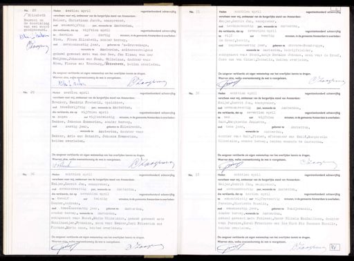 No. 28 (Elizabeth. Renvooi en de doorhaling van een woord goedgekeurd. Dir Dar Zoosm Heden zestien april negentienhonderd achtenvijftig verscheen voor mij, ambtenaar van de burgerlijke stand van Amsterdam: Belser, Christiaan Jacob, aanspreker, oud eenenvijftig jaar, wonende te Amsterdam, die verklaarde, dat op vijftien april negentienhonderd achtenvijftig te dertien uur dertig minuten, in de gemeente Amsterdam is overleden: Blom, Flora Elizabeth, zonder beroep, oud zevenenzestig jaar, geboren te 's-Gravenhage, wonende te Amsterdam, achtereenvolgens gehuwd geweest met: van der Zee, Jan Klaas; van den Meijden, Johannes en: Noah, Wilhelmus, dochter van: isabeth, beiden overleden. Blom, Florus en: Vreeburg,/ei De aangever verklaarde uit eigen wetenschap van het overlijden kennis te dragen. Waarvan akte, welke overeenkomstig de wet is voorgelezen. DZoogrman Ehn J selsen No. 31 Heden achttien april negentienhonderd achtenvijftig verscheen voor mij, ambtenaar van de burgerlijke stand van Amsterdam: Meijer, Gerrit Jan, aanspreker, oud zevenenveertig jaar, wonende te Amsterdam, die verklaarde, dat op zeventien april negentienhonderd achtenvijftig te Vijf uur veertig minuten, in de gemeente Amsterdam is overleden: de Graaf,Gerrit, oud negenenveertig jaar, geboren te Abcoude-Baambrugge, wonende te Amsterdam, bedrijfsleider, echtgenoot van: Stork, Antje Hermina Johanna, zoon van: de Graaf, Cors en: van Ginkel, Cornelia, beiden overleden. De aangever verklaarde uit eigen wetenschap van het overlijden kennis te dragen. Waarvan akte, welke overeenkomstig de wet is voorgelezen. Dhoagrima PJ No. 29 Heden zestien april negentienhonderd achtenvijftig verscheen voor mij, ambtenaar van de burgerlijke stand van Amsterdam: Brenker, Hendrik Frederik, opzichter, oud tweeënvijftig jaar, wonende te Amsterdam, die verklaarde, dat op vijftien april negentienhonderd achtenvijftig te negen uur vijfentwintig minuten, in de gemeente Amsterdam is overleden: Bakker, Johanna Kommerina, zonder beroep. oud zestig jaar, geboren te Sliedrecht, wonende te Amsterdam, dochter van: Bakker, Arie en: Schmidt, Johanna Kommerina, beiden overleden. De aangever verklaarde uit eigen wetenschap van het overlijden kennis te dragen. Waarvan akte, welke overeenkomstig de wet is voorgelezen. DZoogmo HCrenke No. 32 Heden achttien april negentienhonderd achtenvijftig verscheen voor mij, ambtenaar van de burgerlijke stand van Amsterdam: Meijer, Gerrit Jan, aanspreker, oud zevenenveertig jaar, wonende te Amsterdam, die verklaarde, dat op zeventien april negentienhonderd achtenvijfti te zes uur vijftien minuten, in de gemeente Amsterdam is overleden: Smit,Margaretha Jannette, oud twee jaar, geboren te Amsterdam, wonende te Amsterdam, dochter van: Smit, Pieter, aftekenaar en: Kahlé, Margaretha Wilhelmina, zonder beroep, beiden wonende te Amsterdam. De aangever verklaarde uit eigen wetenschap van het overlijden kennis te dragen. Waarvan akte, welke overeenkomstig de wet is voorgelezen. zooging Pr No. 30 Heden achttien april negentienhonderd achtenvijftig verscheen voor mij, ambtenaar van de burgerlijke stand van Amsterdam: Meijer, Gerrit Jan, aanspreker, oud zevenenveertig jaar, wonende te Amsterdam, die verklaarde, dat op zeventien april negentienhonderd achtenvijftig te twaalf uur twintig minuten, in de gemeente Amsterdam is overleden: Hemker,Andreas, oud tweeënzeventig jaar, geboren te Amsterdam, zonder beroep, wonende te Amsterdam, echtgenoot van: Roost, Maria Wilhelmina, gehuwd geweest met: Schiltmeijer, Fransina, zoon van: Hemker, Carl Friedrich en: Flotman,Maria Anna, beiden overleden. De aangever verklaarde uit elgen wetenschap van het overlijden kennis te dragen. Waarvan akte, welke overeenkomstig de wet is voorgelezen. 1 schri/ Ioof No. 33 Heden achttien april negentienhonderd achtenvijftig verscheen voor mij, ambtenaar van de burgerlijke stand van Amsterdam: Meijer, Gerrit Jan, aanspreker, oud zevenenveertig jaar, wonende te Amsterdam, die verklaarde, dat op zestien april negentienhonderd achtenvijftig te eenentwintig uur vijfenveertig minuten, in de gemeente Amsterdam is overleden: Pereira, Charlotta Rosalia, oud eenenzestig jaar, geboren te Bandjermasin, zonder beroep, wonende te Amsterdam, gehuwd geweest met: Patiwael,Oscar Wilhelm Maximiliaan, dochter van: Pereira, Karel Francisco en: Lie Giok Nio Susanna Rosalia, beiden overleden. De aangever verklaarde uit eigen wetenschap van het overlijden kennis te dragen. Waarvan akte, welke overeenkomstig de wet is voorgelezen. P1 DZoogmen