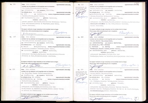 No. 256 Heden drie oktober negentienhonderd achtenvijftig verscheen voor mij, ambtenaar van de burgerlijke stand van Amsterdam: Draaijers, Johannes,zonder beroep, oud zesenzestig jaar, wonende te, Amsterdam, die verklaarde, dat op een oktober negentienhonderd achtenvijftig te acht uur vijfenveertig minuten, in de gemeente Amsterdam is overleden Laauwen, Petrus,zonder beroep, oud vijfenzeventig jaar geboren te Dordrecht, wonende te Amsterdam. gehuwd geweest met: Jansen, Pieternella Wilhelmina Catrina, zoon van: Laauwen, Petrus en Hopstaken, Anna Maria, beiden overleden. De aangever verklaarde uit eigen wetenschap van het overlijden kennis te dragen Waarvan akte, welke overeenkomstig de wet is voorgelezen. Oooman J Draaijers No. 259 goedgekeurd de doorhaling van twee woorden Pr Brrogmn Heden drie oktober negentienhonderd achtenvijftig verscheen voor mij, ambtenaar van de burgerlijke stand van Amsterdam: Meijer, Gerrit Jan,aanspreker, oud achtenveertig jaar, wonende te Amsterdam, die verklaarde, dat op een oktober negentienhonderd achtenvijftig te drieentwintig uur vijftig minuten, in de gemeente Amsterdam is overleden: Kroese, Catharina Maria,zonder beroep, oud zesenzeventig jaar geboren te Kampen, wonende te Amsterdam. echtgenote van: Hendriks, Hendrik,dochter van: Kroese, Willebroddus Kreese-Willebreddus en ten Hove, Johanna Hendrika, beiden overleden. De aangever verklaarde uit eigen wetenschap van het overlijden kennis te dragen. Waarvan akte, welke overeenkomstig de wet is voorgelezen. Crug Ooooermog No. 257 Heden drie oktober negentienhonderd achtenvijftig verscheen voor mij, ambtenaar van de burgerlijke stand van Amsterdam: Gaillard, Adriaan Leendert,zonder beroep, oud zevenenzeventig jaar, wonende te Amsterdam, die verklaarde, dat op een oktober negentienhonderd achtenvijftig te twaalf uur vijfenveertig minuten, in de gemeente Amsterdam is overleden: Stoovelaar, Coenraad Frederik,zonder beroep, oud vierentachtig jaar geboren te Amsterdam, wonende te Amsterdam, echtgenoot van: Maret, Maria,zoon van: Stoovelaar, Johannes Frederik en Been, Elisabeth,beiden overleden. De aangever verklaarde uit eigen wetenschap van het overlijden kennis te dragen. Waarvan akte, welke overeenkomstig de wet is voorgelezen. Joogrmm A L. Ga. Maso No. 260 „ Heden drie oktober negentienhonderd achtenvijftig verscheen voor mij, ambtenaar van de burgerlijke stand van Amsterdam: Meijer, Gerrit Jan,aanspreker, oud achtenveertig jaar, wonende te Amsterdam, die verklaarde, dat op twee oktober negentienhonderd achtenvijftig te veertien uur dertig minuten, in de gemeente Amsterdam is overleden: Houthuijse, Gerard Justus,zonder beroep, oud vierentachtig jaar geboren te Amsterdam, wonende te Amsterdam, echtgenoot van: Hoeve,Neeltje,zoon van: Houthuijse, Justus en Melchior, Gerritje,beiden overleden. De aangever verklaarde uit eigen wetenschap van het overlijden kennis te dragen. Waarvan akte, welke overeenkomstig de wet is voorgelezen. Vaaogrm& Irgr No. 258 Heden drie oktober negentienhonderd achtenvijftig verscheen voor mij, ambtenaar van de burgerlijke stand van Amsterdam: van Elst, Jean Pierre Victor,aanspreker, oud tweeënzestig jaar, wonende te Amsterdam die verklaarde, dat op een oktober negentienhonderd achtenvijftig te drieentwintig uur dertig, minuten, in de gemeente Amsterdam is overleden „ Roest,Willem,laborant, oud negenenveertig jaar geboren te Kampen wonende te Nieuwer-Amstel, echtgenoot van: Brinkman, Wolterdina,zoon van: Roest, Gerrit en Schrijver, Hendrika,beiden zonder beroep en wonende te IJselmuiden. De aangever verklaarde uit eigen wetapschap van het overlijden kennis te dragen. Waarvan akte, welke overeenkomstig de wet is voorgelezen. kone Vrooym No. 261 goedgekeurd de doorhaling van een letter d drie woorden en D V Zootan Heten drie oktober negentienhonderd achtenvijftig verscheen voor mij, ambtenaar van de burgerlijke stand van Amsterdam: Meijer, Gerrit Jan,aanspreker, oud achtenveertig jaar, wonende te Amsterdam, die verklaarde, dat op een oktober negentienhonderd achtenvijftig te achttien uur dertig minuten, in de gemeente Amsterdam is overleden: van Nimwegen, Jannetje Helena,zonder beroep, oud zeventig jaar geboren te Utrecht, wonende te Amsterdam. echtgenote van: Spaltman, Johannes Marinus Hendrik, dochter van: van Nimwegen, Cornelis Willem en de Graaf, Gerrigje, de GraafmGerrigje, beiden overleden. De aangever verklaarde uit eigen wetenschap van het overlijden kennis te dragen. Waarvan akte, welke overeenkomstig de wet is voorgelezen. Ohoogema Gyn