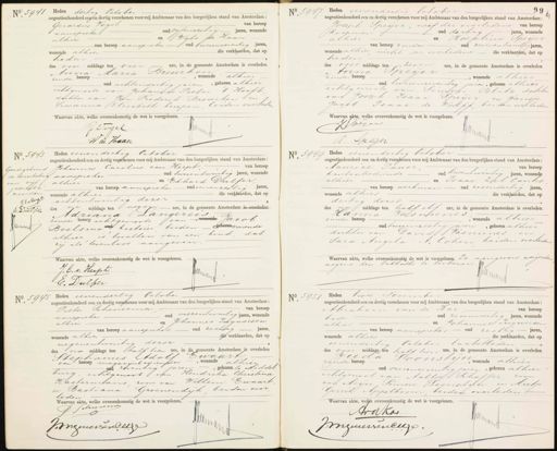 ƒ 5941 No Heden dertig October negentienhonderd een en dertig verschenen voor mij Ambtenaar van den burgerlijken stand van Amsterdam: van beroep Gerardus Vogel oud vijfenzestig Jaren, wonende aanspreker en Wybe de Haan alhier van beroep aanspreker oud tweeenzeventig Jaren, die verklaarden, dat op wonende alhier heden des voor middags ten, vier ure, in de gemeente Amsterdam is overleden 1 Anna Maria Breurken ,wonende alhier zonder beroep — oud achtendertig jaren, geboren alhier echtgenoote van Johannes Pieter t Hooft dochter van Jan Frederik Breurken en Susanna Elisabeth Leupen, beiden overleden Waarvan akte, welke overeenkomstig de wet is voorgelezen. G Jogel D No. 5945 7 Heden eenendertig October 99 negentienhonderd een en dertig verschenen voor mij Ambtenaar van den burgerlijken stand van Amsterdam: loopman neef der overledene van berep Joseph Speijer oud dertig jaren, wonende — en Rosalina Speijer alhier van beroep zonderoud zevenentwintig jaren, wonende alhier, nicht der overledene die verklaarden, dat op heden des voor middags ten zeven ure, in de gemeente Amsterdam is overleden Speijer trina zonder beroep wonende alhier oud tweeenzeventig jaren, geboren alhier echtgenoote van Simon Blitz dahter van Joseph Isaac Speijer en Jansje Jacob Isaac de Wolfp, beiden overleden Waarvan akte, welke overeenkomstig de wet is voorgelezen. Iezee Jn 1 No 5943 14 Goedgekeurd de doorhaling van vijf gedukte woorden J. C. v Herp E. Dulken amar Heden eenen dertig October negentienhonderd een en dertig verschenen voor mij Ambtenaar van den burgerlijken stand van Amsterdam: t Johannes Carolus van Herpt van beroep oud tweeentwintig Jaren, wonende aanspreker en Ekhard Dulfer, alhier. van beroep aanspreker oud eenenzestig jaren, — die verklaarden, dat op wonende alhier. achtentwintig dezer des vf middags ten negen ure, in de gemeente Amsterdam is overleden Adriana Langereis zonder beroep echtgenoote van, wonende Jacob Boelsma koetsier beiden Bbaren wonende dat alhier is bevallen van een kind zij als levenloos aangeven. Waarvan akte, welke overeenkomstig de wet is voorgelezen. J. C. v. Herpt Jm Ee. Dulper No. 5941 9 Heden eenendertig October negentienhonderd een en dertig verschenen voor mij Ambtenaar van den burgerlijken stand van Amsterdam, Maurice Sauer, van beroep kantoorbediende oud drieentwintig jaren, wonende en Isaac Del Canho alhier. van beroep werkman oud zesendertig jaren wonende alhier die verklaarden, dat op dertig dezer des na middags ten half elf ure, in de gemeente Amsterdam is overleden, — hanna Vasnunes wonende alhier zonder beroep oud tweeenzestig jaren, geboren alhier dochter van David Vasnunes en Sara Angela A. Cohen beiden overleden Waarvan akte, welke overeenkomstig de wet is voorgelezen. De aangevers wergerden wegens den Tabboth te teekenen 1 Nan No 5940 13 Heden eenendertig October negentienhonderd een en dertig vergehenen voor mij Ambtenaar van den burgerlijken stand van Amsterdam, van beroep Pieter Schensema oud vierentwintig jaren, wonende — aanspreker en Johannes Ingwersen alhier oud zestig jaren van beroep aanspreker -die verklaarden, dat op wonende alhier negenentwintig dezer des na middags ten halftien ure, in de gemeente Amsterdam is overleden t waar. Stephanus Adol van beroep magazinbediende, wonende alhier, oud zeventig jaren— „geboren te Middel, burg, echtgenoot van Hendrika Christina Kastermans, zoon van Willem Cwaart beiden over er Bastiana Groenendyk leden Waarvan akte, welke overeenkomstig de wet is voorgelezen. C Jdensem Jrg JIenersen deeze o. 5951 N. Heden twee November 251 negentienhonderd een en dertig verschenen voor mij Ambtenaar van den burgerlijken stand van Amsterdam: Abraham van de Kar van beroep oud zesenveertig jaren, wonende bode 1a en Johannes Ingeversen alhier -van beroep aanspieker oud zestig jaren, — wonende alhier die verklaarden, dat op eenendertig. October laatstleden des voor middags ten half tien ure, in de gemeente Amsterdam is overleden Guda Doonstijn wonende alhier zijnde beroep oud vierenzeventig jaren, geboren alhier echtgenoot van Aaltje Scheffer, x van Meyjer, Simon JLoonstijn en Mietje Gerrit Appelboom, beiden overleden Waarvan akte, welke overeenkomstig de wet is voorgelezen. ArdKar J 4 J: Ingenierseneitje.