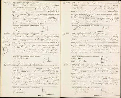 No 4897 Heden achtentwintig Auguslus negentienhonderd een en dertig verschenen voor mij Ambtenaar van den burgerlijken stand van Amsterdam; van beroep Gerrit Born oud zesenviftig jaren, wonende aanspreker en Frans Bruys alhier —van beroep aansprekeroud drieenvijftig Jaren, wonende alhier — de verklaarden, dat op zevenentwintig dezer des voor middags ten twee ure, in de gemeente Amsterdam is overleden rit Jan Bruinsma ge zonder beroep wonende alhier N oud vier weken, geboren alhier zoon van Gerrit Bruinsma vuurstoker en Johanna Hillegonda Rijken zonder beroep, beiden wonende alhier Waarvan akte, welke overeenkomstigde wet is voorgelezen. G Born Pn No. 4903 Heden achtentwintig Augustus negentienhonderd een en dertig verschenen voor mij Ambtenaar van den burgerlijken stand van Amsterdam; Frits Keyser van beroep oud achtentwintig jaren, wonende aanspieker en Barend Poorenburg alhier. wonende alhier— — van beroep aanspreker oud negenenzeventig jaren, — die verklaarden, dat op zevenentwintig dezer des voor middags ten half drie ure, in de gemeente Amsterdam is overleden Alida Elfes wonende alhier beroep zonder oud twee entachtig jaren, geboren te Hooge zand, weduwe van Rinze Velzing 2 dochter van Jan Eltes en Hendrika hunt, beiden overleden Waarvan akte, welke overgenkomstig de wet is voorgelezen. GK Juui 2/1 Jv No 4899 17 Goedgekeurd de doorhaling van vijf gedrukte woorden awEllenn I Vang J Heden achtentwintig Augustus negentienhonderd een en dertig verschenen voor mij Ambtenaar van den burgerlijken stand van Amsterdam Albertus Willemse van beroep oud tweeenvijftig jaren, wonende aanspreker — en Jacobus Pang alhier van beroep aanspieker oud zevenenzestig jaren, wonende alhier die verklaarden, dat op zes en twintig dezer des na middags ten half vijf ure, in de gemeente Amsterdam is overleden Pietske Zijlstra zonder beroep echtgenoote van, wonende Barthols mens oud Johannes Blok, geboren haven arbeider beiden wonende alhier, is bevallen van een kind dat zij als levenloos aangeven Waarvan akte, welke overeenkomstig de wet is voorgelezen. AW Memt Jrmi J. Vang No 4905 N. Heden achtentwintig Augustus negentienhonderd cen en dertig verschenen voor mij Ambtenaar van den burgerlijken stand van Amsterdam; van beroep Jooeph Monterinas, ou drieenvijftig jaren, wonende bode en Abraham Lopes alhier oud vijfenveertig Jaren. Cardozo van beroep bode die verklaarden, dat op wonende alhier achtentwintig dezer des voor middags ten haalf zeven ure, in de gemeente Amsterdam is overleden Abraham Sarphtie ,wonende alhier zonder beroep — — oud twee en negentig jaren, geboren alhier v Tegakerden weduwnaar van Rachel aas zoon van Isaac Sarphtie en Petronella overleden Waarvan akte, welke overeenkomstig de wet is voorgelezen. J Montuns Jin B. Loper Carddzo No. 4901 Heden achtentwintig Augustus negentienhonderd een en dertig verschenen voor mij Ambtenaar van den burgerlijken stand van Amsterdam: Johannes Vos. van beroep oud negenenveertig jaren, wonende aanspreker en Jan Hettelingh alhier van beroep aanspreker oud vierenzeventig Jaren wonende alhier die verklaarden, dat op — zevenentwintig dezer des voor middags ten zeven ure, in de gemeente Amsterdam is overleden Susanna Sophia Carolina, Seders beroep wonende alhier zonder oud achtenzestig jaren, geboren te Haarlem echtgenoote van Dominicus van Nimwegen dochter van Johannes Seders en Susanna Sophia Carolina rener beiden overleden Waarvan akte, welke overeenkomstig de wet is voorgelezen. J. Vos D J. Vbettelingh No 490 N Heden achtentwintig Augustus negentienhonderd een en dertig verschenen voor mij Ambtenaar van den burgerlijken stand van Amsterdam van beroep Bernard Heilman oud achtenvijftig jaren, wonende aanspreker 9 en Jan van Riel — alhier van beroep aanspreke oud eenenveertig jaren — — wonende alhier die verklaarden, dat op zesentwintig dezer— des voor middags ten half een ure, in de gemeente Amsterdam is overleden Harmanus van der Pol wonende alhier zonder beroep oud zesenzestig jaren, geboren alhier weduwnaar van Elisabeth Johanna Meyers, zoon van Harmanus van der Pol en Maria Roppelman, beiden overleden Waarvan akte, welke overeenkomstig de wet is voorgelezen. B Heilnar G J.An v. Riel