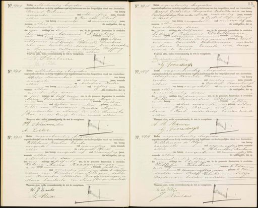 4909 Heden achtentwintig Augustus negentienhonderd een en dertig verschenen voor mij Ambtenaar van den burgerlijken stand van Amsterdam: Bernard Heilman, van beroep oud achtenvijftig jaren, wonende aanspreker — en Jan van Riet alhier van beroep aanspreker oud eenenveertig jaren, wonende alhier — die verklaarden, dat op zesentwintig dezer des voor middags ten tien ure, in de gemeente Amsterdam is overleden 7 Leonardus Adrianus Dronkers, van Oeroop koopman , wonende alhier oud negen endertig jaren, geboren alhier echtgenoot van Grietje Petronella Dronkers zoon van Leonardus Adrianus Dronkersverkman en Susanna Catharina Cornelia Buffing. overleden wonende de vader alhier Waarvan akte, welke overeenkomstig de wet is voorgelezen. — B. Heilman 2 v Riel No. 4915 3 Heden negenentwintig Augustus negentienhonderd een en dertig verschenen voor mij Ambtenaar van den burgerlijken stand van Amsterdam; Joseph Gysbertus Augustus Detollenaere van beroep werktuigkundige broeder van den overleden oud zesendertig jaren, wonende — en Gijsbert Toorenburgh te zeist. oud eenenzeventig Jaren, van beroep aanspreker wonende alhier — die verklaarden, dat op zevenentwintig dezer des na middags ten halp zeven ure, in de gemeente Amsterdam is overleden Lodewijk Franciscus Detollenaere van berrep chanpfeur, wonende alhier 3 oud vierendertig jaren, geboren te zeist zoon van Camille Detollenaere overleden zonder beroep De mets en Maria Emma wonende te Zerst Waarvan akte, welke overeenkomstig de wet is voorgelezen. Dehven dero. J G enbei .4910 N. Heden achtentwintig Augustus negentienhonderd een en dertig verschenen voor mij Ambtenaar van den burgerlijken stand van Amsterdam van beroep Albertus Nieuwenhuis oud veertig Jaren, wonende aanspreker en Antonius Koster alhier van beroep aanspreker oud vijftig Jaren wonende alhier — de verklaarden, dat op zesentwintig dezer— des voor middags ten half zeven ure, in de gemeente Amsterdam is overleden Maria Cornelia Francisca Meier ,wonendealhier zonder beroep oud dertien maanden, geboren alhier dochter van Franciscus Jacobus Meijer grondwerker en Maria Cornelia Franciska 5 Ros zonder beroep, beiden wonende alhier Waarvan akte, welke overeenkomstig de wet is voorgelezen. H C Vienwerk J. G A Koster. No. 4917 Heden negenentwintig Augustus negentienhonderd een en dertig verschenen voor mij Ambtenaar van den burgerlijken stand van Amsterdam Aldegonda Hendrika Zanou van beroep oud veertig jaren, wonende — zonder en gijsbert Poorenburgh alhier. van beroep aanspreken oud eenenzeventig Jaren wonende alhier die verklaarden, dat op zevenentwintig dezer des na middags ten drie ure, in de gemeente Amsterdam is overleden Willem Bernardus Beems wonende alhier zonder beroep oud drie maanden, geboren alhier zoon van Johan Beems werkman en Maria Roch zonder beroep beiden wonende alhier. Waarvan akte, welke overeenkomstig de wet is voorgelezen. A H Hansu J 1/ Voorenburgh 10 N. 4913 Heden negenentwintig Augustus negentienhonderd een en dertig verschenen voor mij Ambtenaar van den burgerlijken stand van Amsterdam: Wilhelmus Josephus Danks van beroep aanspreker oud zesenvijftig Jaren, wonende en August Reiss alhier van beroep aanspiekeroud zesenvyftig jaren wonende alhier die verklaarden, dat of achtentwintig dezer des voor middags ten half acht ure, in de gemeente Amsterdam is overleden Helena Maria Kraayenvanger wonende alhier zonder beroep oud zesenzestig jaren, geboren te Asperen weduwe van Cornelis van Millegen, dochter van Hendrikus Albertus Kraaijenvanger en Maria Lamberta van Nune beiden overleden Waarvan akte, welke overeenkomstig de wet is voorgelezen. W. J Danks 2/ A-Heiss. No 4919 1 Heden negenentwintig Augustus negentienhonderd een en dertig verschenen voor mij Ambtenaar van den burgerlijken stand van Amsterdam, van beroep Willebrordus de Klyn oud negenen vijftig Jaren, wonende aanspreker alhier. en Johannes Nenhaus 1 van beroep aanspreke oud zevenenvijftig aren wonende alhier die verklaarden, dat op zevenentwintig dezer des , na middags ten alf negen ure, in de gemeente Amsterdam is overleden, Willetje Keuken, wonende te Edam zonder beroep — oud zevenenvijftig jaren -, geboren te Edam dochter van Pieter Keuken en Aaltje Bootsman beiden overleden Waarvan akte, welke overeenkomstig de wet is voorgelezen. W de Klijn J 2/ Neuhaus