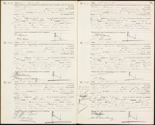 No 5099 N. Goedgekeurd de doorhaling van vijf gedrate woorden F: Schaaf B Toonte rlmms Heden acht September negentienhonderd een en dertig verschenen voor mij Ambtenaar van den burgerlijken stand van Amsterdam; van beroep Peije Schaafsma, „ aanspieker oud tweeenviftig Jaren, wonende N4 y alhier en Barend Poorenburg van beroep aanspieke oud negenenzevenijaren wonende alhier die verklaarden, dat op zes dezer o middags ten half een ure, in de gemeente Amsterdam is overleden Djetske Raakma 29 zonder beroep echtgenoote van wonende Karel WE Roelof oad Weener schuitevoerder Bvoren beiden wonende alhier is bevallen van een kind dat zij als levenloos aangeven. NaaT9r akte, welke overeenkomstig de wet is voorgeleren A: Schaafen J 24 BPvven Jarnn