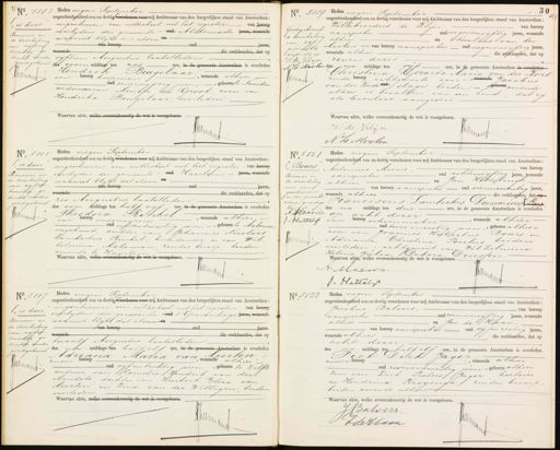 ƒ5113 x N. „is door Renvooi en de doorhaling van vijfen twintig ge. drukke woorden goedgekeurd. Vrenon 2 Heden negen September negentienhonderd een en dertig verschenen voor mij Ambtenaar van den burgerlijken stand van Amsterdam ingeschreven een uittreksel uit het register van heroen overlijden der gemeente- oud Alkemade jaren, wonende waaruit blijkt dat aldaar d- van beroep aren oud wonende die verklaarden, dat op vijftien Augustus laatstleden N des voor- middags ten zes ure, in de gemeente Amsterdam is overleden Beugelaar.- Hendrik van beroep koopman, wonende alhier oud eenenvijftig jaren—, geboren te Naarden weduwaa van Mensse de Groot zoon van Hendrika Beugelaar, overleden. Waarvan akte, wwelke overeenkomstig de wet is voorgelezen. Prran N. 5119 No 1 Goedgekeurd de doorhaling van vijf gedrukts woorden Wde Klijn N.v/d Moolen Dumant „ Heden negen September 30 negentienhonderd een en dertig verschenen voor mij Ambtenaar van den burgerlijken stand van Amsterdam; Willebrordus de Klijn.— van beroep aanspreker oud negenenviftig jaren, wonende 4 alhier en Nicolaas van der Moolen van beroep aanspreker oud negenenvijftig jaren, wonende alhier die verklaarden, dat op zeven dezer ides na middags ten vijf ure, in de gemeente Amsterdam is overleden Christina Gerarda Maria van der Kort zonder beroep echtgenoote van, wonende Jacobus van der Woude oud slager beiden Bvaren wonende alhier is bevallen van een kind dat zij als levenloos aangeven Waarvan akte, welke overeenkomstig de wet is voorgelezen. W de Klijn Jan N v/s Moolen No. 5115 „ is door Renvooi en de doorhaling van vijfen twintig ge, drukte woorden goedgeheurd Jemans 1 Heden negen September negentienhonderd een en dertig verschenen voor mij Ambtenaar van den burgerlijken stand van Amsterdam ingeschreven een uittreksel uit het register- van beroep overlijden der gemeente oud Haarlem Jaren, wonende waaruit blijkt dat aldaar d van beroep oud Jaren, wonende — die verklaarden, dat op zes Augustus laatstleden des voor middags ten half vijf ure, in de gemeente Amsterdam is overleden Thesdora Rinkel „ wonende alhier. van 8er0e onderwijzeren oud achtentwintig jaren -, geboren te Aalsmeer ongehuwd, dochter van Johannes Nicolaas Lambertus Kinkel, kruidenier en van Wil helmina Moleman zonder beroep beiden wonende te Haarlem Waarvan akte, welke overeenkomstig de wet is voorgelezen. Jman No 5121 17 „ Bours Renvooi en de doorhaling van eeni geschreven: en een gedrukt woord goedge keurd. A. Alvens J. Hlettelif Dimans Heden negen September negentienhonderd een en dertig verschenen voor mij Ambtenaar van den burgerlijken stand van Amsterdam: Antonius Moens, van beroep — oud achtenvijftig jaren, wonende aanspreker en Jan Hettelingh — alhier. —van beroep aanspreker oud vierenzeventig jaren, wonende alhier de verklaarden, dat ep „Franciscus Lambertus Dominicus Boers des na middags ten drie ure, in de gemeente Amsterdam is overleden op acht dezer van beroep schoenmaker wonende alhier. oud twee enzestig jaren, geboren alhier zoon van Joannes Hubertus Bours en Adriana Christina Poulus beiden overleden; echtgenoot van Wilhelmina Helena Julia Debora Driessen, Waarvan akte, welke overeenkomstig de wet is voorgelezen. A Maess. Jman d: Vettelijk N 5117 No 31 „ is door Renvooi en de doorhaling van vijfen.