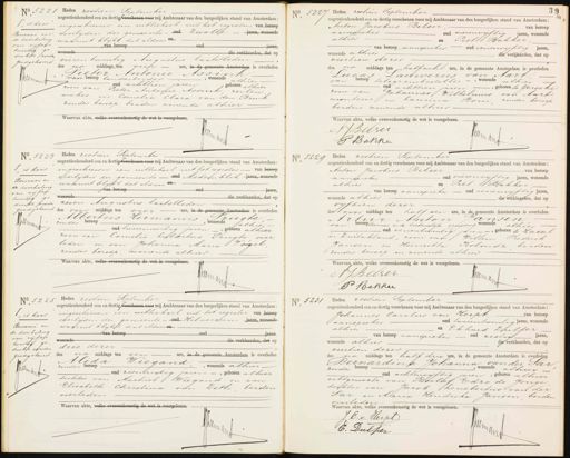 drukte woorden goedgekeurd Jumens Heden zestien September negentienhonderd een en dertig verschenen voor mij Ambtenaar van den burgerlijken stand van Amsterdam ingeschreven een uittreksel uit het register van beroep overlijden der gemeente- oud Zwolle jaren, wonende waaruit blijkt dat aldaar a — van beroep oud — jaren, wonende die verklaarden, dat op vieren twintig Augustus laatstleden des na middagsten vier ure, in de gemeente Amsterdam is overleden Pieter Antonie Assink van beroep landarbeider, wonende slhied oud achttien jaren, geboren alhier zoon van Pieter Antonie Assink zelen maker en Cornelia Clara van den Brink zonder beroep, beiden wonende alhier Waarvan akte, welke overeenkomstig de wet is voorgelezen. 2/ N. 5217 522 Heden zestien September 39 negentienhonderd een en dertig verschenen voor mij Ambtenaar van den burgerlijken stand van Amsterdam Anton Jacobus Belser van beroep aanspreker oud vierenviftig jaren, wonende alhier en Piet Bakker, van beroep aanspreker oud eenenvijftig jaren, wonende alhier die verklaarden, dat op veertien dezer