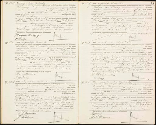 aanspreker M en Frans Bruys alhier. van beroep aanspreker oud drieenvijftig jaren, wonende alhier die verklaarden, dat op achttien dezer des na middags ten half acht ure, in de gemeente Amsterdam is overleden Maria Johanna Hendrika Hellinx, zonder beroep wonende alhier oud zevenenvyftig jaren-, geboren alhier weduwe van Antoniurs verdijk, dochter van Johannes Jacobus Hellinx en Geertrui Geesthuijsen beiden overleden Waarvan akte, welke overeenkomstig de wet is voorgelezen. J: Mngeversen eeize. Jmes 7 No. 5287 7 44 7 Heden negentien September negentienhonderd een en dertig verschenen voor mij Ambtenaar van den burgerlijken stand van Amsterdam: van beroep Jesaya van Praag oud vierenzestig jaren, wonende waker — en Aron Vaz Dias alhier van beroep waker oud vijfenvijftig jaren, wonende alhier die verklaarden, dat op heden des voor middags ten half drie ure, in de gemeente Amsterdam is overleden Jonas Mok Jvan beroep koopman. , wonende alhier oud vierenzestig jaren, geboren alhier echtgenoot van Mietje Grootkerk zoon van Jacob Mok zonder beroep, wonende alhier en Rebekka Koopman overleden Waarvan akte, welke overeenkomstig de wet is voorgelezen. De aangevers weigerden, wegens den Sabbath te teekenen. 1 Wemmgt No 5283 14 3 Heden negentien September negentienhonderd een en dertig verschenen voor mij Ambtenaar van den burgerlijken stand van Amsterdam Antonius van Steensel, van beroep N I oud tweeen zeventig jaren, wonende aanspreker — en Jan de Kleijn, alhier van beroop chransperr 1 oud zesentwintig jaren wonende alhier die verklaarden, dat op achttien dezer des na middags ten vijf ure, in de gemeente Amsterdam is overleden Gijswijf Maria Elisabeth zonder beroep wonende alhier oud zeven enzeventig jaren, geboren alhier weduwe van Johan Bernard Hendrik van hierop dochter van Willem Gijswijt en Maria Elisabeth Lever beiden overleden Waarvan akte, welke overeenkomstig de wet is voorgelezen. A V Seensel Jrnf J. de Kleyn 10 5289 No Heden eenentwintig September negentienhonderd een en dertig verschenen voor mij Ambtenaar van den burgerlijken stand van Amsterdam; Hermanus Bleekemolen. van beroep oud zestig jaren, wonende