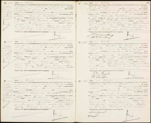 Twee renvooi en de doorhaling van vijfen. twintig ge. drukle woorden goedgekeurd Dmand Heden een October negentienhonderd een en dertig verschenen voor mij Ambtenaar van den burgerlijken stand van Amsterdam ingeschreven een uittreksel uit het register van beroep oud waaruit blijkt jaren, wonende der gemeente Delft- dat aldaar— van beroep jaren oud wonende die verklaarden, dat op achttien September laatstleden des voor middags ten drie ure, in de gemeente Amsterdam is overleden Johanna Hendrina Kramer zonder beroep , wonende alhier oud twee enzeventig jaren, geboren te schiedam eerst weduwe van Jacob van Stight daarna van Arnoldus Spaan, dochter van Johan Casper Kramer en van Cornelia van der Voort beiden overleden Waarvan akte, welke overeenkomstig de wet is voorgelezen. D Ma No 5495 17 Heden een October negentienhonderd een en dertig verschenen voor mij Ambtenaar van den burgerlijken stand van Amsterdam, Albertus Hermanus Groot van beroep aanspreker oud negenendertig jaren, wonende en Frans Bruys alhier van beroep aanspreker oud drieenvijftig Jaren wonende alhier