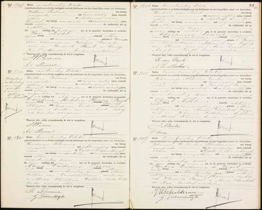 5797 1Heden eenentwintig October negentienhonderd een en dertig verschenen voor mij Ambtenaar van den burgerlijken stand van Amsterdam; V van beroep Willem Postma oud tweeenzestig jaren, wonende aanspreker en Antonius van alhier Steensel van beroep aanspreker oud drieenzeventig jaren wonende alhier die verklaarden, dat op achttien dezer des na middags ten half zes ure, in de gemeente Amsterdam is overleden Jan Bosch zonder beroep , wonende alhier oud zevenenzeventig jaren, geboren te Wanneper veen weduwnaar van Jangje Benak Bosch en Geertje zoon van Hendrik Jan Oosterveen beiden overleden Naatan Aeo de e isogee ostina „ . . . . . . . . . . . . . . . . . . . . . . . . . . . . . . . . . . . . . . Juni No 5603 17 3 Heden tweeentwintig October 8 negentienhonderd een en dertig verschenen voor mij Ambtenaar van den burgerlijken stand van Amsterdam: 1e van beroep Hendrik van Beek. oud zevenenvyftig jaren, wonende aanspreker en Nicolaas van der alhier Moolen van beroep aanspreker oud negenenvijftigaren, — „ wonende alhier die verklaarden, dat op eenentwintig dezer des voor middags ten acht ure, in de gemeente Amsterdam is overleden Adrianus Louie, van beroep hunstschilder, wonende alhier oud zesenzestig jaren -, geboren te Bergen in Noordholland echtgenoot van Trijntje van Sluis zoon van Arie Louwe en Aagtje Rieft verden overleden Waarvan akte, welke overeenkomstig de wet is voorgelezen. H van Beek. Prmaf Vir No. 5799 N Goedgekeurd de doorhaling van vijf gedruat woorden. W Vosling A v Hteensel umans Heden eenentwintig October negentienhonderd een en dertig verschenen voor mij Ambtenaar van den burgerlijken stand van Amsterdam; „ van beroep Willem Postma oud twee en zestig jaren, wonende