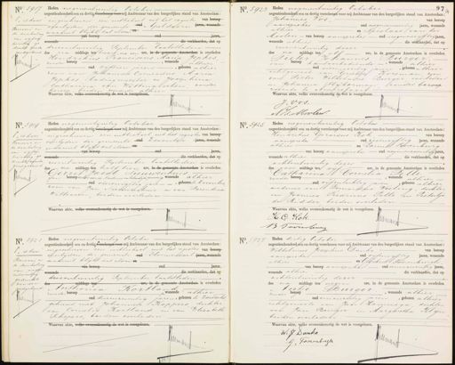 Noo 5917 14 „ is door Renvooi en de doorhaling van vijfen twintig ge drukee voorden goedgekeurd J 149 Heden negenentwintig October negentienhonderd een en dertig verschenen voor mij Ambtenaar van den burgerlijken stand van Amsterdam: ingeschreven een uittreksel uit het register van beroep oud Apeldoorn jaren, wonende overlijden der gemeente waaruit blijkt dat aldaar oud jaren, van beroep die verklaarden, dat op wonende. 1 drieentwintig September laatstleden des na middags ten kwart na een ure, in de gemeente Amsterdam is overleden Hendrikus Franciscus Maria Gephes ,wonende alhier zonder beroep H oud vijftien jaren— ,geboren alhier 1 zoon van Johannes Coenradus Maria Jepkes ladingmeester en Josephina zonder Catharina van Wittmarschen beroep, beiden wonende alhier Waarvan akte, welke overeenkomstig de wet is voorgelezen. Jrnan No. 5923 Heden negenentwintig October negentienhonderd een en dertig verschenen voor mij Ambtenaar van den burgerlijken stand van Amsterdam, Johannes Vos van beroe aanspreker oud negenenveertig jaren, wonende alhier - en Nicolaas van der — Moolen van beroep aanspreker oud negenenviftig jaren wonende alhier - die verklaarden, dat op zevenentwintig dezer des na middags ten elf ure, in de gemeente Amsterdam is overleden Pieter Johannes Burger. van beroep kantoorbediende, wonende alhier oud vierenveertig jaren, geboren alhier echtgenoot van Grietje Koreman zoon van Pieter Wilhelmus Burger overleden en Johanna Slijkerman zonder beroep wonende te Amersfoort Waarvan akte, welke overeenkomstig de wet is voorgelezen. J. Vos. Pman N Jd. Moolen. 1 „ is door Renvooi en de doorhaling van vijfen twintig gedrukk woorden goedgekeurd Jrnn Heden negenentwintig October negentienhonderd een en dertig verschenen voor mij Ambtenaar van den burgerlijken stand van Amsterdam, ingeschreven een uittreksel uit het register van beroep overliden der gemeente oud Deventer jaren, wonende waaruit blijkt dat aldaar o — oud jaren, van beroep werende die verklaarden, dat op -zes entwintig September laatstleden des na middags ten half tien ure, in de gemeente Amsterdam is overleden Gerrit Jacob Nieuwenhuis van beroep rectoer aan de Academie voorliehanlijke opvoeding wonende alhier oud vierenvijftig jaren-, geboren te Deventer zoon van Jan Nieuwenhuis en van Berendina Witteveen, beiden overleden Waarvan akte, welke overeenkomstig de wet is voorgelezen. Ju N. 5925 5923 Heden negenentwintig October — negentienhonderd een en dertig verschenen voor mij Ambtenaar van den burgerlijken stand van Amsterdam, van beroep Hendrikus Gerardus Kok— oud zesenviftig jaren, wonende aanspreker en Barend Poorenburg alhier -van beroep aanspreker oud negenenzeventig Jaren, wonende alhier — die verklaarden, dat op achtentwintig dezer des voor middags ten vijf ure, in de gemeente Amsterdam is overleden Catharina Cornelia Pelle zonder beroep— ,wonende alhier oud vijfentachtig jaren, geboren alhier weduwe van Bernardus Veeling, dochter van Joannes Fredricus Pelle en Pietertje de Ridder beiden overleden. Waarvan akte, welke overeenkomstigde wet is voorgelezen. H. G. Kol. Vrn B vveenleinng No 5921 17 1„ is door: Renvooi en de doorhaling van negen entwintig gedrukt woorden goedgekeurd Wemank Heden negene negentienhonderd een en dertig verschenen veer mij Ambtenaar van den burgerlijken stand van Amsterdam, ingeschreven een uittrekeel uit het register van beroep overlijden der gemeente oud Bloemendaal jaren, wonende waaruit blijkt dat aldaar on n9 van beroep Jaren, oud die verklaarden, dat op wonende September laatstleden drieentwintig ure, in de gemeente Amsterdam is overleden dertiddags ten Anthonia Rortlan d wonende alhier zonder beroep oud drieenzeventig jaren, geboren te Dordrecht 1 gehuwd met Johannes Roppers dochter Elizabeth van Cornelis Kortland en van Schepers, beiden overleden Waarvan akte, welke overeenkomstig de wet is voorgelezen. Jan A N. 5927 8 59D7 Heden dertig October negentienhonderd een en dertig verschenen voor mij Ambtenaar van den burgerlijken stand van Amsterdam: Wilhelmus Josephus Danko van beroep oud vyfenviftig Jaren, wonende aanspreker en Gysbert Poorenburgh alhier van beroep aanspreker oud eenenzeventig jaren wonende alhier — die verklaarden, dat op achtentwintig dezer des na middags ten negen ure, in de gemeente Amsterdam is overleden Intje Burger, zonder bezoep wonende alhier oud een enzestig jaren, geboren alhier — echtgenoote van Jan Hammega dochter van Jan Burger en Margaretha Klijn beiden overleden Waarvan akte, welke overeenkomstig de wet is voorgelezen. H J Danks J G, Toorenbuugh 4/4