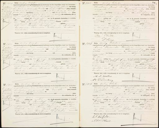 No: 5929 No „ is door Renvooi en de doorhaling van zevenen twintig ge drukk woorden goedgekeurd. Jumans Heden dertig October negentienhonderd eeh en dertig verschenen voor mij Ambtenaar van den burgerlijken stand van Amsterdam, ingeschreven een uittreksel uit het dagregister gehouden van beroep aan boord van het stoomschip Fimaloer oud waaruit bliktdat jaren, wonende aan boord van bovengenoemd stoomschip d zich bevindende op twaalf graden drie en van beroep veertig minuten - ou8 Noorderbreedte en Jaren, wonende twee envijftig groden en twee minuten osterlings de verklaarden, dat op een en twintig Juni laatstleden des na middags ten half elf ure, in de gemeente Amsterdam is overleden Hendrik Jacob Bruinsma van beroep behoorende tot de bemanning, wonende alhier ongehuwd, oud negenendertig jaren, geboren zoon van Hidde Bruinsma en Antonia hu doorca. Petronella Vollaerts beiden overleden. Waarvan akte, welke overeenkomstig de wet is voorgelezen. Prmns No. Heden dertig October 8 negentienhonderd een en dertig verschenen voor mij Ambtenaar van den burgerlijken stand van Amsterdam: Christiaan Jacob Belser van beroep 2 oud vierentwintig jaren, wonende aanspreker en Jacobus Pang alhier. van beroep aanspreke oud achtenzestig jaren, wonende alhier die verklaarden, dat op achtentwintig dezer des na middags ten vier ure, in de gemeente Amsterdam is overleden Nicolaas Matthijs Bergman zonder beroep wonende alhier — oud negentien jaren, geboren alhier zoon van Cornelis Bergman koopman en Elisabeth Sophia Maria Cavalini zonder beroep, beiden wonende alhier Waarvan akte, welke overeenkomstig de wet is voorgelezen. Chr. J Beiser. J tang No 510 N 5931 ¶„ is door Renvooi en de doorhaling van vijfen twintig ge. drukke woorden goedgekeurd. Pun Heden dertig October negentienhonderd een en dertig verschenen voor mij Ambtenaar van den burgerlijken stand van Amsterdam. ingeschreven een uittreksel uit het register van beroep Delftjaren, wonende overlijden der gemeente oud waaruit blijkt dat aldaars van beroep jaren, oud wonende die verklaarden, dat op veertien dezer des na middags ten half vier ure, in de gemeente Amsterdam is overleden Jana Spul , wonende alhier zonder eroep — oud vyf en tachtig jaren-, geboren alhier ongehuwd, dochter van Johannes Hendrik Hopker, beiden Apil en Maria Ludia overleden. Waarvan akte, welke overeenkomstig de wet is voorgelezen. Penan No 5937 11 Heden dertig October 7 negentienhonderd een en dertig verschenen voor mij Ambtenaar van den burgerlijken stand van Amsterdam, Maria Frederika Wouters, van beroep oud drieenzestig jaren, wonende zonder en Barend Toorenburg alhier -van beroep aanspreker oud negenenzeventig Jaren wonende alhier die verklaarden, dat op heden des voor middags ten vijf ure, in de gemeente Amsterdam is overleden 3 Petronella Geertruida Inei zonder beroep wonende alhier oud zevenentachtig jaren, geboren alhier weduwe van Jacob Nikolaas Hendrik Ruyt 4 dochter van Jan Bel en Elizabeth Kohler beiden overleden Waarvan akte, welke overeenkomstig de wet is voorgelezen. M. F Houters P an B Tovent p No 5933 N. ¶ is door Renvooi en de doorhaling van vijfen. twintig ge drickte woorden goedgeheurd. Julmand Heden dertig October negentienhonderd een en dertig verschenen veor mij Ambtenaar van den burgerlijken stand van Amsterdam: ingeschreven een uittreksel uit het register van beroep jaren, wonende overlijden der gemeente oud Zwolle waaruit blijkt dat aldaar a Jaren oud van beroep die verklaarden, dat op vorende negen dezer ure, in de gemeente Amsterdam is overleden des na - middags ten acht Hendrik Roelof Reyinga van beroep handelsueiziger wonende alhier - oud zevenenveertig jaren, geboren alhier echtgenoot van Mina hucretia van den Broek, zoon van Tjerk Reyinga over leden en van Geziena Dinkela zonder beroep wonende alhier Waarvan akte, welke overeenkomstig de wet is voorgelezen. Jman No 5930 14 9 Heden dertig October negentienhonderd een en dertig verschenen voor mij Ambtenaar van den burgerlijken stand van Amsterdam Lodewijk Poulus Kesseler, van beroep oud achten dertig jaren, wonende aanspreker en August Reiss alhier van beroep aanspreker oud zesenvijftig jaren wonende alhier — die verklaarden, dat op negenentwintig dezer des na middags ten half drie ure, in de gemeente Amsterdam is overleden Cornelis Hermanus van Wees , wonende alhier zonder beroep, oud acht jaren geboren alhier a zoon van Cornelis van Tees expediteur en Clementina Schep, zonder beroep beiden wonende alhier Waarvan akte, welke overeenkomstig de wet is voorgelezen. L. P. Kisseler. Jman Reiss. A