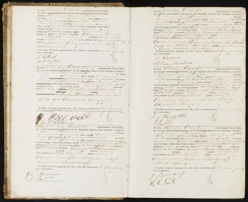 Op heden dertig October Achttienhonderd Vier-en-Vijtig, zijn voor ons ondergeteekende Ambtenaar van den Burgerlijken Stand der Stad Amsterdam, verschenen: Ciaas Marten Rieck van beroep gien oud drieendertig Jaren wonende brouwers Gracht N 100 zoon van de Overledene, en Tin Pieter Weitzel van beroep aanspreker oud achtentwintig Jaren, wonende Ggulueronstraat va5 bekende van de Overledene, welke hebben verklaard, dat op zeven en twintig dezer des na middags ten alf acht ure, in het huis, staande veerenstraat Kanton 3, Buurt KM6 No. 392, is overleden Elaus Marten Rieck van beroep Kantoorlooper wonende als boven in den ouderdom van vifenzeventig Jaren geboren te Etzehoe Echtgenoot van Antje Schuurman En hebben wij hiervan opgemaakt deze Akte, welke na voorlezing door de aangeverden ons is onderteekend. C MRlreik J. P. Weitzel AG Op heden dertig October Achttienhonderd Vier-en-Vijftig, zijn voor ons ondergeteekende Ambtenaar van den Burgerlijken Stand der Stad Amsterdam, verschenen benraad Simon van beroep vooindrager oud vierenveertig Jaren, wonende haarlemmerdyk t 1144 broeder van de Overledene, en Mouuts van Meverden van beroep als boven oud drieenveertig Jaren, wonende als boven Unz11 bekende van de Overledene, welke hebben verklaard, dat op zernentwintig dezer des na middags ten Elf ure, in het huis, staande rosenstraat Kanton 4 Buurt N No.373, is overleden Johan Friederich Wilhelm Amon Janberoep kantoorbegiende wonende ges boven in den ouderdom van Eenen zestig Jaren geboren alhier Echtgenoot van Johanna Margaretha Kachel zoon van Johan Heinrich Simon, overleden en Anna Wilhelmina Meijer En hebben wij hiervan opgemaakt deze Akte, welke na voorlezing door de aangevers ons is onderteekend. C Simon Reg M Van Meverden derti October Achttienhonderd Vier-en-vijtig, zijn voor ons ondergeteekende Ambtenaar van den Burgerlijken Stand der Stad Amsterdam, verschenen: Mozes Roodveldt van beroep geen oud zesentwintig Jaren, wonende marken s91 van de Overledene en Ionas Abraham waterman van beroep mersbelmaker oud voeeendertig Jaren, wonende wildenburg R 115 van de Overledene, welke hebben verklaard, dat op eden des voor middags ten vijf ure, in het huis, staande artien Kanton 1 Buurt I No. 9, is gerleden van Mozes Roodveldte tahaee od in den ouderdamMa Abraham Waterman geboren Een dochter welke als levenloos is aangegeven En hebben wij hiervan opgemaakt deze Akte, welke na voorlezing door de aangevers en ons is onderteekend Goidkeurende de doorhaling van veertien gedrukte woords 1 OE vell 1 Jug Op heden dertig October Achtienhonderd Vier-en-Vijtig zijn voor ons ondergeteekende Ambtenaar van den Burgerlijken Stand der Stad Amsterdam, verschenen Tacob van Huyster van beroep n bode oud zesenveertig Jaren, wonende weesperstraat N 573 bekende van de Overledene, en Hendrik Willem Bije van beroep bode oud zesenviftig Jaren, wonende n Loogerstraat Hct 368, bekende van de Overledene, welke hebben verklaard, dat op Veegenentwintig dezer des voor middags ten drie ure, in het huis, staande Kerkstraat Kanton 1 Buurt W No. 772, is overleden Johannes Thilihhus Aats van beroep geen wonende alsboven in den ouderdom van Achttien Jaren geboren alhier Ongehuwd, zoon van Johan Philip Christina Krop En hebben wij hiervan opgemaakt deze Akte, welke na voorlezing doorde aangevers en ons is onderteekend. J: v Hugstee Pei je Op heden dertig October Achtienhonderd Vier-en-vijtig, zijn voor ons ondergeteekende Ambtenaar van den Burgerlijken Stand der Stad Amsterdam, verschenen: Jan Hverman van beroep timmerman oud negendertig Jaren, wonende sterfhuis vader van de Overledene, en Antonie Postema van beroep als boven oud vieren veertig Jaren, wonende Utrechtschaanstrt Z247 bekend van de Overledene, welke hebben verklaard, dat op zeven entwintig dezer des na middags ten negen ure, in het huis, staande Korteleidschdwstraat Kanton 2 Buurt CC No 124, is overleden Annetje Moerman van beroep wonende als boven in den ouderdom van drie Jaren geboren alhier dochter van Jan Moerman en wyle Elisabeth Sinselmeyjer En hebben wij hiervan opgemaakt deze Akte, welke na voorlezing door de llangevers en ons is onderteekend. Jan Moerman P A Postema OJ Op heden dertig October Achttienhonderd Vier-en-Vijtig zijn voor ons ondergeteekende Ambtenaar van den Burgerlijken Stand der Stad Amsterdam, verschenen Johann Burggraf van beroep kleermaker oud vijfenveertig Jaren, wonende sterfhus vader van de Overledene, en Hendrik Cornelis Smit van beroep timmerman oud vijfenzestig Jaren, wonende boomsloot N 338, grootvader van de Overledene, welke hebben verklaard, dat op zeven entwintig dezer des na middags ten tien ure, in het huis, staande suitersteeg Kanton 1 Buurt A No. 151, is overleden Anna Maria Burggraf van beroep wonende als boven 1 in den ouderdom van drie Jaren geboren alhier dochter van Johann Burggraff en Maria Smit En hebben wij hiervan opgemaakt deze Akte, welke na voorlezing door de aangevers ons is onderteekend. J Burggras x Regg H. C. Smi