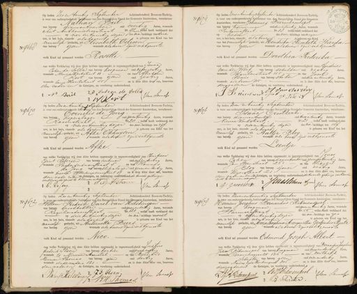 Blog van beroep sjouer oud zestig Jaren, wonende Keijerstraat 21 en is deze Akte door ons, benevens den vader en eende, betuigen, na voorlezing onderteekend de treede getuige verklarrte niet te kunnen schrijven 2JOnaslohentzen J Grootheyk Van Lenep No 4672 Op heden Zesentwintig September Achttienhonderd Zeven-en-Tachtig, is voor ons ondergeteekende Ambtenaar van den Burgerlijken Stand der Gemeente Amsterdam, verschenen: Willem Fredrik Carel van Helsdingen. van beroep broodbakker oud zevenendertig Jaren, wonende Reguliersdnrisstraat No. 121, welke heeft verklaard dat — op drie en twintig dezer des na middags ten acht ure, in het huis, staande als boven is geboren een Kind van het mannelijk geslacht, uit Antoinette Beers van beroep geen wonende als boven zijne echtgenoote welk Kind zal genaamd worden Nico. van welke Verklaring wij deze Akte hebben opgemaakt in tegenwoordigheid van Allus gedenik Iesen van beroep barbier oud zesenvyftig Jaren, wonende te Aieuwer Amstel en van Bernord Herman Thomas van beroep gen oud dertig Jaren wonende Eideouders 121. en is deze Akte door ons, benevens den vader en de Getuigen, na voorlezing onderteekend. 2 J.F Ilsen. Van Sennep WWarsRelsdinger 13 B.H. Thomas. No 9678 Op heden Zevenentwintig September Achttienhonderd Zeven-en-Tachtig is voor ons ondergeteekende, Ambtenaar van den Burgerlijken Stand der Gemeente Amsterdam, verschenen: Henricus Josephus Bernardus Lukmenspoel- van beroep Koopman. oud zevenentwintig Jaren, wonende Warmoesstraat. No. 56, welke heeft verklaard dat op vijfentwintig dezer des na middags ten zes ure, in het huis, staande als boven, is geboren een Kind van het mannelijk geslacht, uit Maria Josephina Margaretha Gertrudis Startz van beroep geen wonende als boven zyne echtgenoote welk Kind zal genaamd worden Edmond Joseph Albert. van welke Verklaring wij deze Akte hebben opgemaakt in tegenwoordigheid van Bernardus Josephuuis Johan Rikmenspoel van beroep koopman oud tweeendertig Jaren, wonende Brouwersgracht 136 en van Berthold — schriter van beroep geen oud vierendertig Jaren, wonende Nuune Zyds Voorbuiqual 206 en is deze Akte door ons, benevens der vader en de Getuigen, na voorlezing onderteekend. JDimerspoel 2 BIJ Rekmenchoel Van Lemepr 3 B. Schroter.