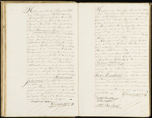 Leden den Tweede Augustus Acht tien Honderd en Elf des voor de Middags Quart over tien uuren Ver scheen voor mij Gerrit ten Sande Adjunct Maire der Stad Amsterdam als Ambtenaar van de Burgerlyke Stand Harmanus Over, woonende in de oude Loyersstraat No 70 Canton ¶ van beroep gravers knegt, geadsisteert voor twee getuigen de eerste Nicolaas Over, oud Vyftig Jaaren, wo nende in Voetboogstraat No 3, van beroep Graavers baas, de Tweede, Frans Kraamer, oud zestig Jaaren, woonende in de Lauwerierstraat No 4 van beroep Gravers Knegt de welke my verklaart heeft dat zijne Vrouwe Dorothea Albrink, woonende ten huize van haare man, van beroep Tapster, op den Eerste x deezer, des Nagts ten drie uuren is bevalle van een zoon, aan de welke de, voor naam gegeeve is, van Hendricus Johannes Ingevolge bovenstaande verklaaring en op het verzoek van voornoemde Vader heb ik deze Acte gesteld welke de eerste getuigen, na mijne voorlezing met my heeft geteekend, declareerende zo wel de Vader, als de Tweede getuigen niet te kunnen schryven Niolaus over Gerrit ten Sande t. 19 S eden den Tweede Augustus Achttien Honderd en Elf des voor de middags ten half Elf uuren verscheen voor my Gerrit ten Sande Adjunct Saire der stad Amsterdam als Ambtenaar van de Burgerlyke Stand, Engeltje kamphuy zen, woonende op de Reguliers by de agter gragt N:o 51. van beroep Boedvrouw, goad sioteerd door twee getuigen, de Eerste Dirk Meyer, oud twee en Viftig Jaaren, woonende in Hodersstraat No 78 van beroep Turfdra ger, de Tweede Frans Waalders oud drie en dertig Iaaren woonende op het Dlakken Veld boven N:o 19. zonder beroep 6 de welke my verklaard heeft dat zi op den Negen en Twintigste Iuly laastleede verlost heeft Anna Vastenband, Huisvrouw van Antonie Stoltekamp, woonende in de Noorder straat No. 77. van beroep Karreman des avonds ten half Negen uuren van een zoon aan de welke de voornaam zal gegeve worde Jan Arnoldus, Ingevolge bovenstaande verklaaring en op het verzoek van voornoemde vroedvrouw heb ik deze Acte gesteld, welke de voormelde vroedvrouw en de Twee getuigen na mijne voorleezing met my hebben geteekendd Gerrit ten Sande Engelije kamt huyzen Dit1mien Pvan SWaanders