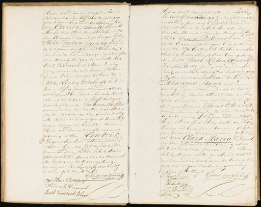 Heden den Tweden September Achtienhondertelf des middags quart voor Een uur verscheen Voor my Gerrit ten Sande Adjunct Maine der Stad Amsterdam als Ambtenaar van den burgerlijken Stand Willem Bieving wonende op het prinsentjland N 6 Canton. 6. van beroep koorndrager geadsisteerd door twee getuigen de eerste Hendrik Verniers oud drie en zestig Jaren wonende als boven N81 van beroep koorndrager de tweede Dirk Hendrik Blase oud drie en Viftig Jaren wonende Meede als boven N 60. zonder beroep dewel „kemy verklaard heeft dat zijne Vrouwe Anna Biemerstorffer wonende ten huize van hare san zonder beroep op den Een endertig „ste deezer des morgens Arcahalf negen uuren is bevallen van een zoon aande welke de voonaam gegeven is van Hendrik Ingevolge bovenstaande verklaring en op het verzoek van voornoemden vader heb ik deeze acte gesteld dewelke de voormelde vader en de twee getuigen na mine Voorleeling met my hebben getekend. Gerrit ten Sande Willem Breving Hendrik Verniers Drik Hendrik Blaal Heden den Tweede September Achtien hondert elf desmiddags ten half Twee uure verscheen voor mi Gerrit ten Sande Ropinct Maire der Stad Amsterdam res Ambtenaar van de Burgerliken Stand Frans (Poortenaar wonende op de Cloveniersburgwal by de nieuwmarkt N 70. Canton M1. Van beroep Apohecar geadsisteerd door twee getuigen de eerste Jacob Rubenkon ingoud Zeven en dertig jaren wonende op de hoek van de keizersgragt en Leydsche gragt, N 179 van beroep Apothecar de tweede Johannes Adami oud zes en dertig Jaren wonende op de heeregracht by kasten straat zonder beroep, dewelke my verklaard heeft dat zijne Vrouwe Maria Oftenoort wonende ten huyzen van hare manzonder beroep op den Negenen Twintigsten Augustus des Avonds Circa Negen Uuren is bevallen van een dogter dan dewelke de voornaam gegelven is van Elara Maria Ingevolge bovenstaande verklaring en op het verzoek van voornoemden Vader heb ik deeze Acte gesteld welke de voormelde vader en de twee getuigen na mijne voorleezing met mij hebben getekend. Gerrit ten Sande A. Voorten aar Kubenkoning J. Adamo I
