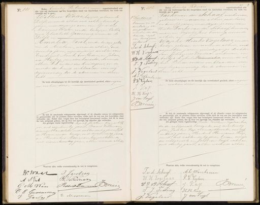 No. 101 Heden twintig Februari negentienhonderd acht :zijn voor mij Ambtenaar van den burgerlijken stand van Amsterdam verschenen, ten einde een huwelijk aan te gaan Willem Waar, kapper, geboren te Delft, wonende alhier, oud achtentwintig jaren, meerderjarige zoon van Gerardus Marinus Waar, zonder beroep, en Catha rina Elisabeth Groeneweg, wonende te Delft, en Amalia Nenk, zonder beroep, gebo„ ren te Arnhem, wonende alhier, oud twintig jaren, minderjarige dochter van Emanuel Nenk, overleden, en Johan na Hartog pensionhoudster, wonende alhier De ouders des bruidegams, en de moeder der bruid verklaarden voor mij tegenwoordig toe te stemmen in dezen echt. De beide afkondigingen tot dit huwelijk zijn onverhinderd geschied, alhier negen en zestien dezer Ik heb de aanstaande echtgenooten afgevraagd of zij elkander nemen tot echtgenooten en getrouwelijk alle de plichten zullen vervullen, welke door de wet aan den huwelijken staa verbonden zijn. Nadat deze vragen door hen bevestigend beantwoord werden, heb ik, in naam der wet, uitspraak gedaan, dat zij door het huwelijk aan elkander zijn verbonden. Als getuigen waren tegenwoordig: zaak Jacobson, diamantslyj per, oud zesentwintig jaren, Barend Velleman diamanthandelaar, oud achtendertig jaren, Rijk de Haan, zonder beroep, oud tweeenveertig jaren en Hendrikus Moorman, kappersbediende, oud vierentwintig jaren, allen wonende alhier Waarvan akte, welke overeenkomstig de wet is voorgelezen. No. 102 Woudsma Renvooi en de doorhaling van een geschreven woord in den veer tienden regel van boven goed¬ gekeurd.— J. v.d. Schaaf. W.H. Vogelas WD vD Toumt P. J Toeven J. Vogelaar A L Wouder P.W: Vogelaar. J. Kap H. H Konij J van tuyl Breeeel Heden twintig Februari negentienhonderd ach zijn voor mij Ambtenaar van den burgerlijken stand van Amsterdam verschenen, ten einde een huwelijk aan te gaan: Iaeke van der Schaaf, werkman geboren en wonende alhier oud twee, en twintig jaren, meerderjarige zoon van Wiebe Durks van der Schaaf, timmer „man, en Trijntje Jans Toering, wonende alhier, en Wapke Hinke Vogelaar zonder beroep geboren en wonende alhier, oud negentien jaren, minderjarige dochter van Johannes Jogelaar, werkman, en Ankje Lijneles Wondstra, wonende al hier: Beider ouders verklaarden voor mij tegenwoordig toe te stemmen in dezen echt. rW De beide afkondigingen tot dit huwelijk zijn onverhinderd geschied, alhier negen en zestien dezer Ik heb de aanstaande echtgenooten afgevraagd of zij elkander nemen tot echtgenooten en getrouwelijk alle de plichten zullen vervullen, welke door de wet aan den huwelijken staat verbonden zijn. Nadat deze vragen door hen bevestigend beantwoord werden, heb ik, in naam der wet, uitspraak gedaan, dat zij door het huwelijk aan elkander zijn verbonden. Als getuigen waren tegenwoordig: Pieter Willem Vogelaar, broe der der echtgenoote loodgieter, oud eenentwintig jaren Jacobus Kap diamantbewerker, oud vijf„ en dertig jaren, Hendrik Hermanus Knip smid, oud achtendertig jaren, beiden zwager des echtgenoots, en Jacob van Tuijl, werkman oud veertig jaren, allen wonende alhier Waarvan akte, welke overeenkomstig de wet is voorgelezen. ƒ 11 W:o Waal I Jacobson B. Velleman A NEnk Brevel G M Waar Rusta C. C Groenenies Moorn 7 GantgJ AL Woudma J. v: d: Schaaf W: H: Vogelaar P: W: Vogelaar W D vD Schuuf JJ Kop Brevel J J Toaring H H. Vruy J van Tuyl J. Vogelaar.