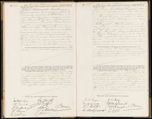No. 103 Heden twintig Februari negentienhonderd acht zijn voor mij Ambtenaar van den burgerlijken stand van Amsterdam verschenen, ten einde een huwelijk aan te gaan: Johan Coenraad Moolenizer hulpconducteur bij de posterijen, geboren te Beemster, wonende te Rotterdam, oud negenentwintig jaren meerderjarige zoon van Hendrik Willem Moolenijzer koopman, en Cornelia Kluun, wonen„ de alhier, en Hendrika Baruch zonder beroep, geboren te Nieuwer-Amstel, wonende alhier, oud zesentwintig jaren, meerderjarige dochter van Isaak Baruch, overleden, en Grietje Oostra, zonder beroep, wonende alhier, De ouders des bruidegoms, en de moeder der bruid verklaarden voor mij tegenwoordig toe te stemmen in dezen echt. De beide afkondigingen tot dit huwelijk zijn onverhinderd geschied, alhier te Kot terdam en te Utrecht, negen en zestien dezer, Ik heb de aanstaande echtgenooten afgevraagd of zij elkander nemen tot echtgenooten en getrouwelijk alle de plichten zullen vervullen, welke door de wet aan den huwelijken staat verbonden zijn. Nadat deze vragen door hen bevestigend beantwoord werden, heb ik, in naam der wet, uitspraak gedaan, dat zij door het huwelijk aan elkander zijn verbonden. Dls getuigen waren tegenwoordig Hendrik Kreeft, zonder beroep oud negenenvyftig jaren, Willem Franz Kreeft, portbeambte, oud drieendertig jaren, Tranusius Johannes van Veersen werkman, oud achten vijftig jaren, en Johan Coenraad Kluun neef des echtgenoots, zonder beroep, oud achten twintig jaren, allen wonende alhier. mstig de wet is voorgelezen. No. 104 Heden twintig Februari negentienhonderd acht zijn voor mij Ambtenaar van den burgerlijken stand van Amsterdam verschenen, ten einde eer huwelijk aan te gaan: Jacobus Nicolaas Huijser, mahoos geboren te Oegstgeest, wonende alhier, oud drieentwintig jaren, meerderjarige zoon van Dirk Huyser, overleden, en Petro„ nella Josephina Holstijn, zonder beroep wonende alhier, en Abigael Malipaart, zonder be roep, geboren te Vlissingen, wonende alhier oud vijfentwintig jaren, meerderjarige doch ter van Cornelis Malipaart besteller en Dina Klaassen, wonende te Vlissin„ gen. De moeder des bruidegoms, en de ou„ ders der bruid verklaarden voor mij tegenwoordig toe te stemmen in dezen echt- De beide afkondigingen tot dit huwelijk zijn onverhinderd geschied, alhier twee en negen dezer De bruidegom verklaar„ de mij de identiteit ziner ouderswegens naams verschil en onvolledigheid in de overgelegde stukken Ik heb de aanstaande echtgenooten afgevraagd of zij elkander nemen tot echtgenooten en getrouwelijk alle de plichten zullen vervullen, welke door de wet aan den huwelijken staat verbonden zijn. Nadat deze vragen door hen bevestigend beantwoord werden, heb ik, in naam der wet, uitspraak gedaan, dat zij door het huwelijk aan elkander zijn verbonden. als getuigen waren tegenwoordig: Jan le Roij bootwerker oud negenenviftig jaren, wonende alhier, David Ma„ lipaart broeder der echtgenoote, smid oud zeven„ entwintig jaren, wonende te Vlissingen Hen„ drik Huijser, broeder des echtgenoots zeeman, oud eenentwintig jaren, en Pieter Johannes Michels, magazynmeester, oud vijfentwin„ tig jaren beiden wonende alhier. De moeder der echtgenoote verklaarde niet te kunnen naorsteekenen, als hebbende geen echijven gelaeren Waarvan akte, welke overeenkomstig de w. Kb. Kregft C Korlengeen WF. Jeek H Baruch. Breuel L H. W. Moolenym J. v. Veersen C Kluun JcKluun G Cort va J le Boij J. N. Huyser A Malipaart Otbakpaard vrlingen Drevee P J Holstijn 6 JJ. Micher CMalipaart