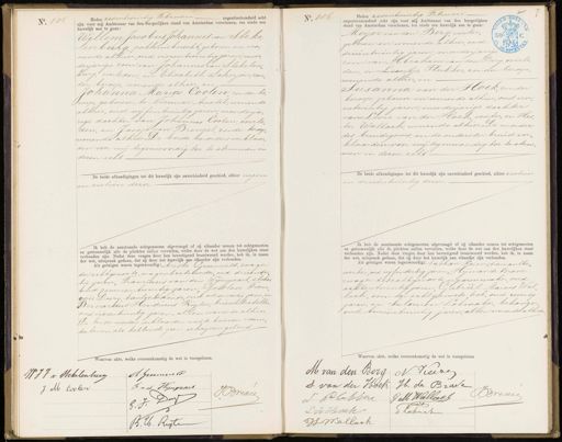 No. 105 Heden zesentwintig Februari negentienhonderd acht zijn voor mij Ambtenaar van den burgerlijken stand van Amsterdam verschenen, ten einde een huwelijk aan te gaan: Willem Jacobus Johannes van Steke lenburg, pakhuisknecht, geboren en woo„ nende alhier, oud vierentwintig jaren, meer„ derjarige zoon van Johannes van Stekelen„ burg, overleden, en Elisabeth Scherjon, zon„ der beroep, wonende alhier en Johanna Maria Coolen zonder be„ roep, geboren te Nieuwer Amstel, wonende alhier, oud vijfentwintig jaren meerderja rige dochter van Johannes Coolen, overle den, en Jansje van Breugel, zonder beroep wonende alhier De beide moeders verklaar den voor mij tegenwoordig toe te stemmen in dezen echt. De beide afkondigingen tot dit buwelijk zijn onverhindend geschied, alhier negen en zestien dezer Ik heb de aanstaande echtgenooten afgevraagd of zij elkander nemen tot echtgenooten en getrouwelijk alle de plichten zullen vervullen, welke door de wet aan den huwelijken staat verbonden zijn. Nadat deze vragen door hen bevestigend beantwoord werden, heb ik, in naam der wet, uitspraak gedaan, dat zi door het huwelijk aan elkander zijn verbonden. Als getuigen waren tegenwoordig: Anske Groeneveld, zwager der echtgenoote, wagenbestuurder, oud drieender tig jaren, Franciscus van den Wijngaart, stoker oud zevenentwintig jaren Gastare Fran cois Dury kantoorbediende, ond vierenveertig jaren, en Bernardus Hendricus Rigter, brievenbestellen oud vierentwintig jaren, allen wonende alhier De beide moeders verklaarden niet te kunnen naam, teekenen, als hebbende geen schrijven geleerd. No. 106 Heden zesentwintig Februari TI. negentienhonderd acht zijn voor mij Ambtenaar van den burgerlijken stand van Amsterdam verschenen, ten einde een huwelijk aan te gaan: P Meyjer van den Berg, venter NN25 geboren en wonende alhier, oud 5 drieëntwintig jaren meerderjarige unt zoon van Abraham van den Berg, overle„ den, en Leentje Slukker, zonder beroep, wonende alhier, en Susanna van der Holk, zonder beroep, geboren en wonende alhier, oud eén entwintig jaren, meerderjarige dochter van Levie van der Hoek, venter, en Hes ter Wallach, wonende alhier De moeder des bruidegoms, en de ouders der bruid ver„ klaarden voor mij tegenwoordig toe te stem„ men in dezen echt.— De beide afkondigingen tot dit huwelijk zijn onverhinderd geschied, alhier zestien en drieentwintig dezer Ik heb de aanstaande echtgenooten afgevraagd of zij elkander nemen tot echtgenooten en getrouwelijk alle de plichten zullen vervullen, welke door de wet aan den huwelijken staat verbonden zijn. Nadat deze vragen door hen bevestigend beantwoord werden, heb ik, in naam der wet, uitspraak gedaan, dat zij door het huwelijk aan elkander zijn verbonden. Als getuigen waten tegenwoordig: Cathan Keizer, diamantbe„ werker, oud vyfendertig jaren, Hijman de Brave zwager des echtgenoots, sigarenmaker oud achtentwintig jaren Gabriël Marius Wal lach oom der echtgenoote kok, oud zeventig jaren, en Salomon Lakmaker, behanger oud tweeentwintig jaren, allen wonende alhier Waarvan akte, welke overeenkomstig de wet is voorgelezen. vden Berg &. eeze A GroeneneCo W JJ v Hekelenburg F vd Wyngaart J M Coolen BBredee G. J: Drn B.H. Rigle M van den Berg W Jinzen J. van der Holk H. de Brave Brevee G M Walluch J Blyppen L. vd Hoek dKaknatus J Wallach